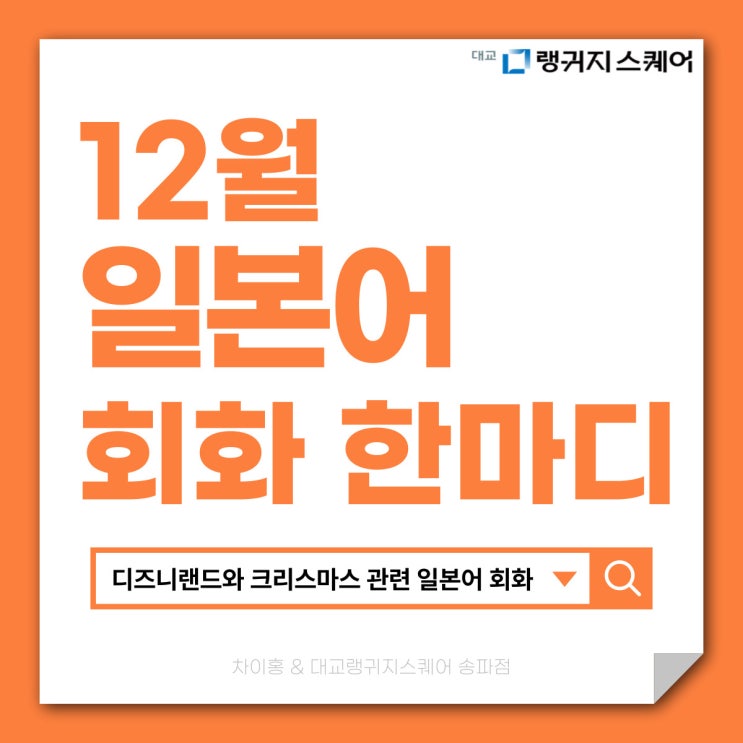 12월, 일본어와 함께 크리스마스를 준비해요! 안녕하세요! 차이홍&대교랭귀지스퀘어 송파점입니다 잠실/강동/하남 지역에 거주하며 **일본어 회화(일본어회화)**를 찾는 분들께 추천! 일본어 수업은 실전 회화 중심으로 진행되어 실생활에서 바로 쓰는 표현을 익히기 좋답니다 :) 일본에서는 12월이 되면 거리가 반짝이고, 화려한 조명이 켜지고, 겨울 분위기가 물씬 납니다. 예를 들어, 도쿄의 마루노우치 거리나 역 주변, 그리고 도쿄 디즈니랜드 에서는 크리스마스 장식과 퍼레이드가 열려요 기유노 선생님과 함께하는 일본어 학습 시간에 “일본의 크리스마스 인사말 / 겨울 회화 / 크리스마스 관련 문장” 등 함께 배워보는 시....... <img src="https://blogthumb.pstatic.net/MjAyNTEyMDhfMTQz/MDAxNzY1MTYzNTQ4Mjg2.ZT4EXK4mN1z0tfikMkVRvEC0SYSBXbLcp_4BoGBJYpUg.nThZBJrn8hHuSbGPBYi7neQ3kY6GDDCfiK0U-DQqxCog.JPEG/%C1%A6%B8%F1%C0%BB-%C0%D4%B7%C2%C7%D8%C1%D6%BC%BC%BF%E4_-006.jpg?type=s3" />