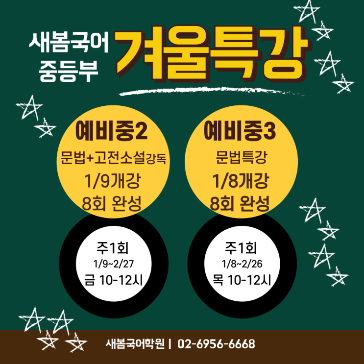 <예비중2> 문법+고전소설 강독 ■ 8회 완성 ■ 수업일시 : 금 10:00-12:00 (1/9~2/27, 주1회) ■ 수업내용 : 음운, 우리말과 우리글, 사동·피동 및 인용 표현 등 중2교육과정+고전소설 강독 <예비중3> 문법 특강 ■ 8회 완성 ■ 수업일시 : 목 10:00-12:00 (1/8~2/26, 주1회) ■ 수업내용 : 문장성분, 문장의 종류 등 중3 교육과정 <img src="https://blogthumb.pstatic.net/MjAyNTEyMDlfNTIg/MDAxNzY1MjcxOTc1MjY0.zlUl4qmlGpTB5xS1c3JylR4wSoeOWCFqPnqSOga4NP0g.fMLngxBuW2UIBCEZlyIvPqZeJQR20Zi0CY8J-GqoJxwg.PNG/2025%B0%DC%BF%EF%C6%AF%B0%AD-001_%282%29.png?type=s3" />