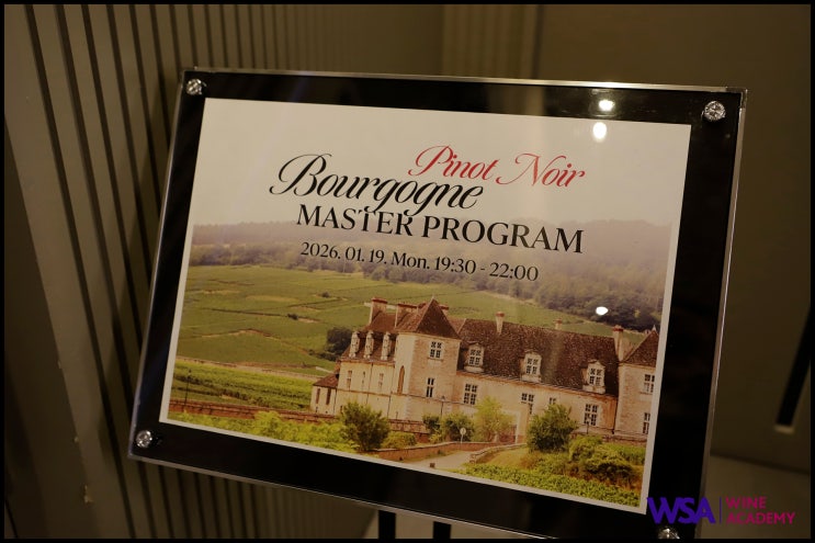 안녕하세요 WSA와인아카데미입니다. 지난 1월에 진행된 '부르고뉴 와인 마스터 과정 - Pinot noir' 후기를 들려드리도록 하겠습니다. 부르고뉴를 대표하는 다섯 개 마을의 대표 피노 누아를 한 자리에서 비교 시음하는 특별한 시간이었는데요. 같은 품종이 떼루아에 따라 얼마나 다른 얼굴로 피어나는지, 그 생생한 차이를 직접 경험해 보는 여정이었습니다. 이번 역시 부르고뉴 전문가 백은주 대표 강사님과 함께하였는데요 단순한 시음을 넘어 ‘부르고뉴의 핵심 마을들을 이해하는’ 시간이었습니다. 구조감이 돋보이는 'Gevrey-Chambertin', 실크처럼 부드러운 'Chambolle-Musigny', 힘과 밀도가 느껴지는 &#x....... <img src="https://blogthumb.pstatic.net/MjAyNjAyMjFfMjg4/MDAxNzcxNjQzMTA3MzYz.L7-k7RcmaFs4j9OKj2qjGDUCxQoqlnmKS_FVAv4NIagg.ruj2ATKXkQD6id6w4f2UDoIy-gvk7KglQ2ER__Xvy2sg.JPEG/_MG_0379.jpg?type=s3" />