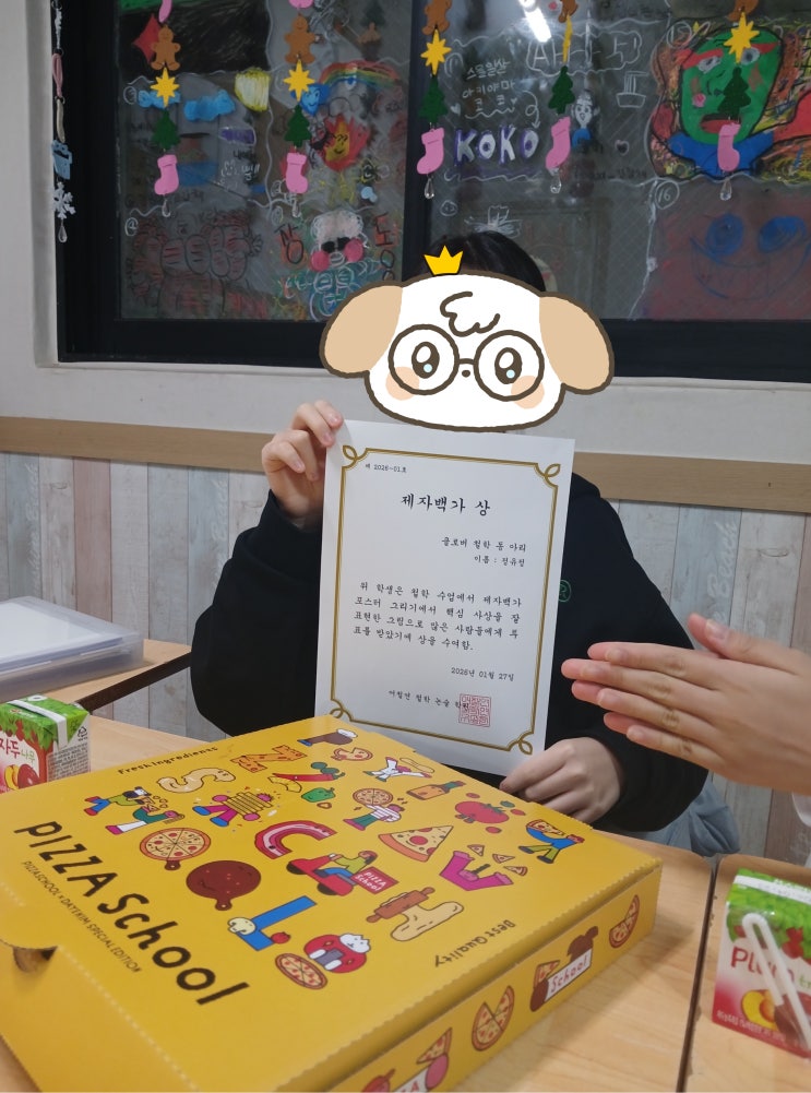 지난 달에 진행한 제자 백가 포스터 그리기에서 수상자가 발표되었습니다. 가장 많은 투표를 차지한 포스터의 주인공은 늘 열심히 학습한 유정 철학자입니다. 꼬마 철학자들의 마음을 움직인 유정 철학자에게 상장과 피자를 선물했습니다. 상으로 받은 피자를 동아리 친구들과 맛있게 나눠 먹는 유정 철학자 덕분에 빵긋 웃으며 수업했습니다. 진심으로 수상을 축하드립니다. <img src="https://blogthumb.pstatic.net/MjAyNjAyMTNfMjg4/MDAxNzcwOTc4NTgzNzcw.FThlJs7N5uTVAEwXODA0NKiSdphXPk24hHL4Mke0Eugg.WPIgznUasqH3WF9p9I97G6fxU1fTfqma2yCkyVxMcNkg.JPEG/%C1%A6%B8%F1%C0%BB-%C0%D4%B7%C2%C7%D8%C1%D6%BC%BC%BF%E4_-001_%287%29.jpg?type=s3" />