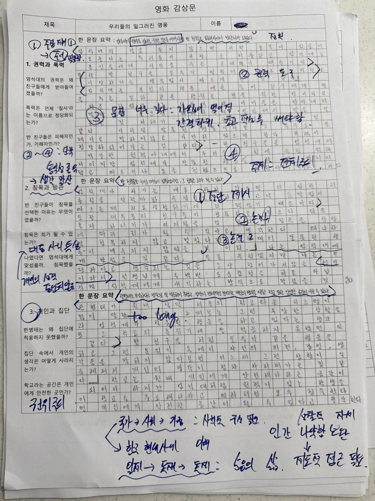 영화 우리들의 일그러진 영웅을 봅니다. 감상문 주제를 던집니다. 인권의 중요성과 한국 현대사에 대해 수업합니다. 학생들이 영화 감상과 느낀점에 대해 써봅니다. 주제의식에 맞게 첨삭해 줍니다. 수업은 이렇게 해야합니다. 이렇게 해야 실력이 상승합니다. 문제 풀이는 정답이 아닙니다. 그렇게 시험문제 출제 안합니다.. <img src="https://blogthumb.pstatic.net/MjAyNjAyMjBfMTYy/MDAxNzcxNTUwNTE1MDc3.tvHvVn3dYJlTFONholuD88wJR4gC9AxBOTK-swLeEDMg._w_mwukuk0927_X10W0TFBrb6bcUA25OdTHsMZ9t3Vsg.JPEG/%BF%AA%BB%E7.jpg?type=s3" />