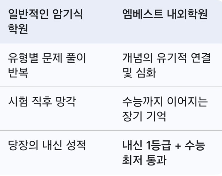 학부모님들의 가장 큰 고민은 아마 이것일 겁니다. "학원 시험 점수는 잘 나오는데, 왜 실전 수능 점수는 제자리일까?" 단순히 눈앞의 내신 점수 몇 점을 올리는 것은 '기술'이지만, 수능이라는 거대한 산을 넘는 것은 '기초 체력'과 '사고력'의 문제입니다. 잠시 반짝하고 사라지는 성적이 아니라, 결정적인 순간 수능에서 진가를 발휘하는 공부. 엠베스트 내외 학원이 지향하는 진짜 실력의 차이를 소개합니다. "잠시 반짝"에 속지 마세요 많은 학생들이 시험 기간에만 반짝 공부하고 시험이 끝나면 모든 내용을 휘발시킵니다. 하지만 수능은 3년간의 누적된 사고력을 측정하는 시험입....... <img src="https://blogthumb.pstatic.net/MjAyNjAyMjBfMjIz/MDAxNzcxNTU5Nzk5MzE5.KCaMNQLqeFZuvbO-kvgaZrMiyDGYpXbOQqa0quPEi7kg.JSBlE3hru-LFQWqv8iau0ux1YybFGn03-q9iVGqqDj8g.JPEG/900%A3%DFScreenshot%A3%DF20260220%A3%DF125632%A3%DFGoogle.jpg?type=s3" />