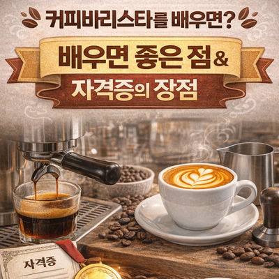자격증 취득까지 해야 하는 진짜 이유 요즘 커피는 단순한 음료가 아니라 기술 · 취업 · 창업 · 취미까지 이어지는 하나의 전문 분야가 되었습니다. 카페는 계속 늘어나고 있고, 그만큼 전문 바리스타에 대한 수요도 꾸준히 증가하고 있습니다. 그렇다면 바리스타 과정을 배우면 어떤 점이 좋을까요? 자격증까지 취득하면 어떤 차이가 있을까요? 지금부터 한 번에 정리해드립니다. ✔ 바리스타 과정을 배우면 좋은 점 1️⃣ 커피를 “제대로” 이해하게 됩니다 평소 마시던 커피도 과정 수강 후에는 완전히 다르게 느껴집니다. 원두 종류 차이 이해 추출 방식별 맛 차이 로스팅 단계별 향 변화 이렇게 커피의 구조를 이해하면 단순 소....... <img src="https://blogthumb.pstatic.net/MjAyNjAyMTlfNjEg/MDAxNzcxNDYyMzk2NTkx.l0FKtboOeET-P2_VccAMcuUKptqA-BwmVdEnJHApPMkg.SqvrYyBidU5N5Nh-lxgqlmnvLF_wgRtKLPJFOUYnJqgg.PNG/dd10622f-2058-4c18-b60b-46b283c5b57e.png?type=s3" />