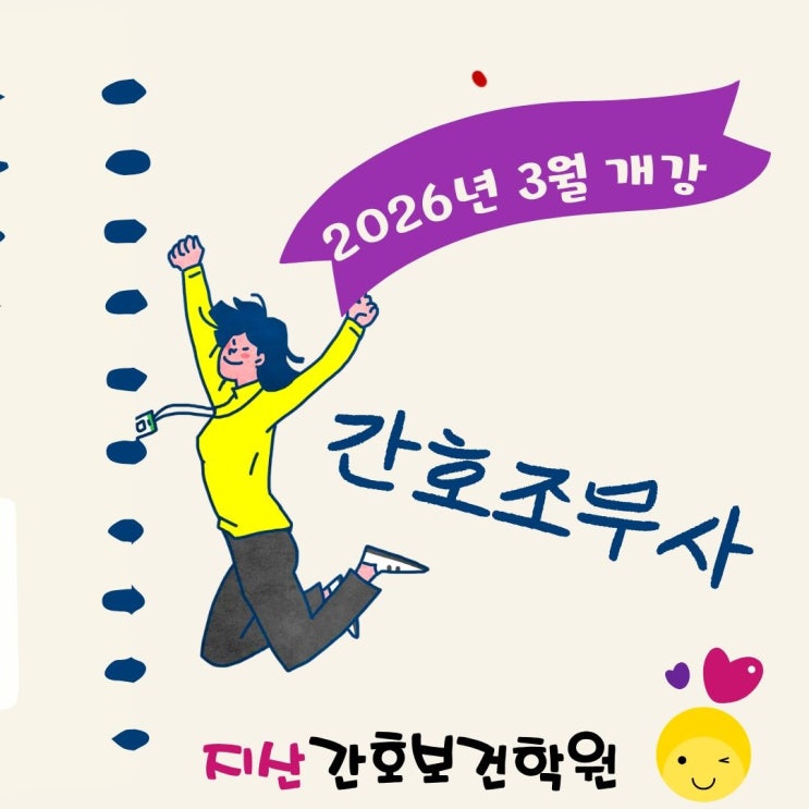 안녕하세요~ 부산간호학원,지산간호보건학원을 방문하여 주셔서 감사합니다 2026년 상반기 개강반 안내 드리고자 합니다 1년 정규과정이고 설날지나고 새로운 삶을 계획하시는 분 관심 가져 주세요~ 특히 30대~40대~50대 분들 많이 관심 가져 주세요. 100세 시대에 인생에서 가장 현실적 선택의 기로에 고민이 많은 시기가 아닐까 싶네요. 나이 때문에 고민이신 분~ 취업 준비 혼자 어려우신 분~ 정년 걱정없이 오래 일 할 수 있는 직업 찾고 계신 분~ 너무 늦은다고 걱정만 하고 계신 분~ 2026년 붉은 말의 기운 얻어 이번에 꼭 한 번 해 봐요~ 간호조무사 자격증 손에 넣고 취업 합시다 지산간호보건학원에서 간호조무사 준비 함께해요~ 저희 지....... <img src="https://blogthumb.pstatic.net/MjAyNjAyMDNfMSAg/MDAxNzcwMTExNjM0MjUy.f3NU4LF_QKZygJhyqwvQLvc5SQ6SJLRNZebStBKbSowg.PEO4Nf1fujDPnT41LUodG90sRgd93beeolRNEDJLBx4g.JPEG/%C1%A6%B8%F1%C0%BB_%C0%D4%B7%C2%C7%D8%C1%D6%BC%BC%BF%E4._%2813%29.jpg?type=s3" />