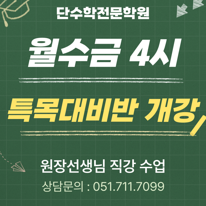기초부터 심화까지 단단하게 단수학전문학원 입니다. 월 수 금 4시!! 특목고나 자사고를 희망하는 학생들을 위한 수업이 개설되었습니다. 초6부터 가능하며 선착순 5명, 테스트 필수입니다. 원장 선생님 직강으로 개별 맞춤 수업을 진행합니다. 상담문의 시 특목반 수업 원한다고 말씀해 주세요^^ 단수학전문학원 원장이야기 바로가기 ↓↓↓ 교육상담 tel:051-711-7099 네이버 톡톡상담 ↓↓↓ <img src="https://blogthumb.pstatic.net/MjAyNjAyMjFfMTQ3/MDAxNzcxNjQwNTkwMDIy.Y9q7v2rS1hSTGkEVYYy2T3KtvJznpN0IBbBZeXXHqBwg.cMsoUe9jRKMqEwzZidd4rmOmfrbEXzVcJ9jeQayz4R4g.PNG/%BF%F8%C0%E5%B9%DD.png?type=s3" />