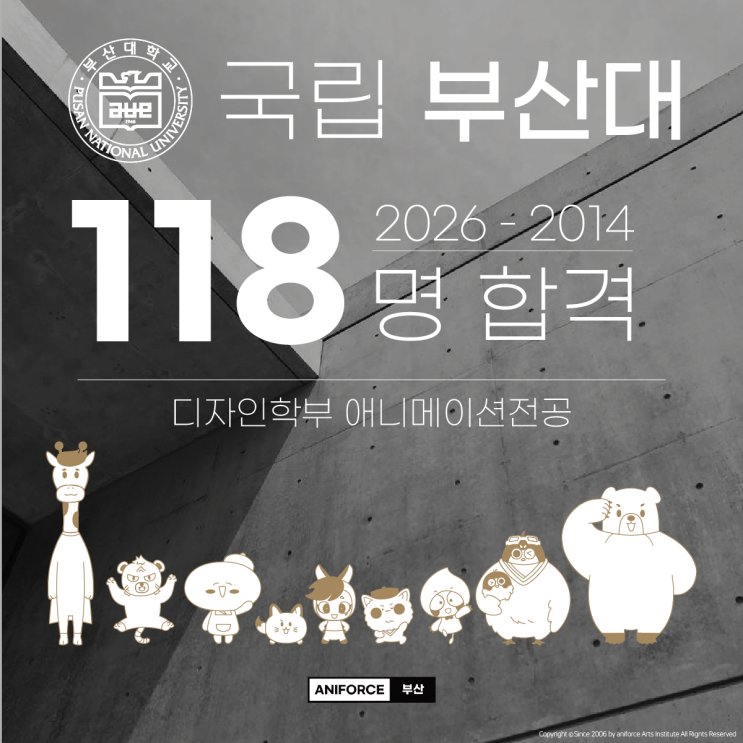 부산대표만화학원 부산 대표 만화학원이라는 자부심 결과로 자신 있게 말합니다. 부산 최고 예술대학, 부산대학교 애니메이션과 합격 소식을 전합니다. 2013년부터 2026년까지 총 118명의 부산대 애니메이션과 합격자 단독 배출 오랜 시간 쌓아온 노하우와 체계적인 교육 그리고 학생들의 노력으로 만들어낸 결과입니다. 부산대학교 애니메이션과 합격자 누적 수에서 부산 애니포스보다 많은 만화학원은 대한민국 어디에도 없습니다. 저희는 단순히 합격 실적만 이야기하지 않습니다. 118명의 실제 합격 성적 데이터와 합격 재현작까지 입시 준비에 필요한 모든 자료를 완벽하게 준비해 놓고 있습니다. 최근 3년간 부산대학교 애니메이션과 합격....... <img src="https://blogthumb.pstatic.net/MjAyNjAzMDZfMjEz/MDAxNzcyNzkwNzA3NzUy.sPsChkmeotHj02o4gRwmICIIM2tIxtEZMmbmRcduk5og.T6hrbUcSgP8Mu4iGa18ynTSuPUlzjThDTOcvlFjeg0cg.PNG/2026-2014_%BA%CE%BB%EA%B4%EB_%C7%D5%B0%DD%BD%E6%B3%D7%C0%CF.png?type=s3" />