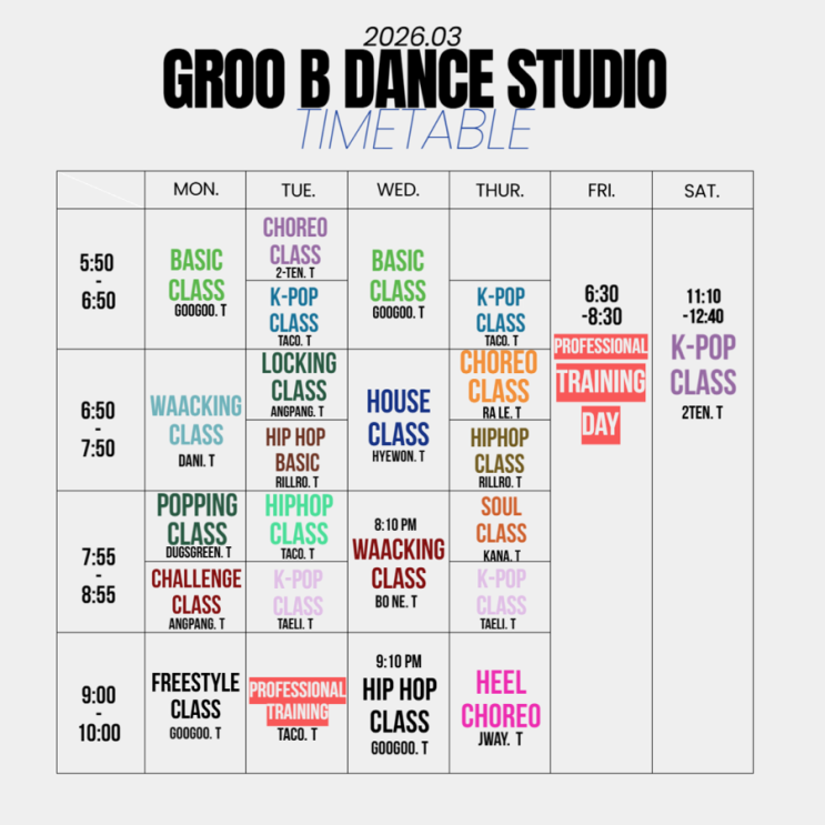 안녕하세요 그루비댄스스튜디오학원입니다 경성대 부경대역 5번출구에 있는 부산댄스전문학원 입니다!! 이번 스케쥴표를 올리려고 하는데 잘 모르시는 분들이 많으셔서 블로그에도 올립니다 ㅎㅎ 인스타를 활발히 하다보니 ㅠㅠ 늦은점 죄송합니다 ! 아 ...!!! 두시에 있는 댄스클래스가 있어요 혹시나 궁금하시면 연락주세요 상담문의 01058511259 051-612-1058 네, 이 시간표는 GROO B DANCE STUDIO 2026년 3월 수업 운영표예요 한눈에 보면 요일별 / 시간대별 / 장르별 / 강사별 클래스 구성입니다. 시간대 구조 • 1교시: 5:50 ~ 6:50 • 2교시: 6:50 ~ 7:50 • 3교시: 7:55 ~ 8:55 • 4교시: 9:00 ~ 10:00 ⸻ 요일별 정리 월....... <img src="https://blogthumb.pstatic.net/MjAyNjAzMTNfMTI4/MDAxNzczMzc5MTYyMzE1.mHg1knb0vU-1rm6PUp1xO47TSFeb1NC-bvJYc8hI9Fsg.XNw0sPbRSMB-buT0_WyK3noX06JM67TRw6ON7MGP-Kkg.PNG/IMG%A3%DF9666.PNG?type=s3" />