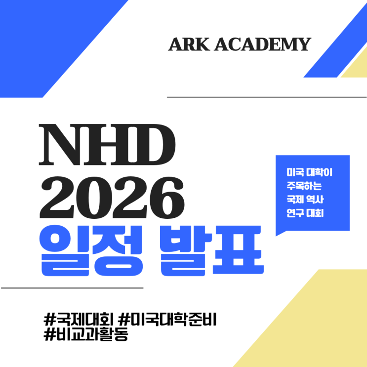 안녕하세요 :) 서울 대치동과 부산 센텀에 위치한 아크 영어학원입니다. NHD 2026 일정이 드디어 공개되었습니다 아크는 Junior / Senior 부문 모두 출전 준비가 되었는데요 ! 오늘은 영어 말하기·라이팅을 넘어 리서치 기반 국제대회 경험까지 연결하고자 하는 National History Day (NHD) 에 대해 정리해드리겠습니다. ️ National History Day, 어떤 프로그램인가요? National History Day는 미국에서 시작된 중·고등학생 대상 국제 역사 연구 프로그램입니다. 학생이 직접 역사적 주제를 선택하고 1차·2차 사료를 조사하고 분석을 통해 논지를 세우고 하나의 프로젝트로 완성하는 연구 중심 국제대회입니다. 그래서 미국 대학 준비....... <img src="https://blogthumb.pstatic.net/MjAyNjAyMTJfMjkx/MDAxNzcwODMzODgwNjAw.cSK4obDLPu7RFgtsjt-YfJOjuuW0yW566tIeC4eT6AIg.F-Re1FsAGZBCRwsTpCHui1-m64ugiCHHQaStB8PNCKgg.PNG/1.png?type=s3" />