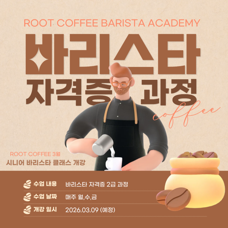 안녕하세요 인천바리스타학원 구월동바리스타학원 루트커피바리스타학원 인천구월점 입니다. 따뜻한 봄기운이 느껴지는 3월, 새로운 도전을 시작하기 딱 좋은 시기죠 그래서 준비했습니다. 3월 9일부터 시니어 바리스타 2급 과정이 새롭게 개강합니다 ☕ 리뉴얼 기념 50% 할인 학원 리뉴얼 기념으로 수강료 50% 할인 이벤트를 진행합니다!! “배워보고는 싶었는데 망설였다” “지금 시작해도 괜찮을까 고민했다” 그런 분들께 부담을 조금 덜어드리고 싶었습니다 정원제로 운영되기 때문에 조기 마감될 수 있습니다. ☕ 수업 일정 안내 개강 : 3월 9일 요일 : 월 · 수 · 금 ⏰ 시간 : 오후 1시 ~ 3시 오전 일정이....... <img src="https://blogthumb.pstatic.net/MjAyNjAyMjBfMjQ2/MDAxNzcxNTY4NzI0NDg2.m5PQUThkWad48fUJJEoTI-cp39hKrPbgKctl0GA_crwg.PylDFH4Ezyf-7bgAwdjCoxIrW45DJf0bJ0zxeFxKhXYg.PNG/%C1%A6%B8%F1%C0%BB_%C0%D4%B7%C2%C7%D8%C1%D6%BC%BC%BF%E4._%281%29.png?type=s3" />