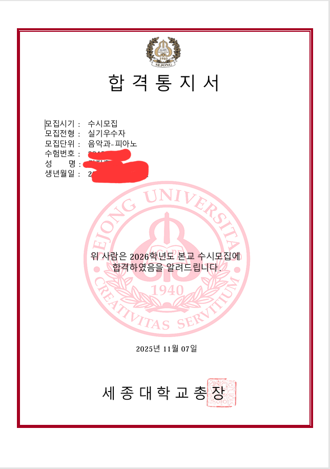안양예고 3학년이 재학중인 김ㅇㅇ 학생이 세종대와 명지대 수시 모집에 합격했습니다. ㅇㅇ이 이야기를 조금 해보면 2023년 1학년 7월에 피아노 전공을 하고 싶다고 왔을때 체르니 30정도 배웠던 인문계 고등학생이었습니다. 우선 더듬더듬 모차르트 소나타와 하농을 시작으로 기초부터 다지기 시작하며 예고 편입을 권했습니다. 남자 아이라 힘이 좋았고 듣는 귀가 좋았으며 일단 악보를 본 다음에는 습득력 또한 빨랐습니다. 그렇게 쇼팽 에튀드를 준비하여 12월 안양예고 편입에 합격하게 됩니다. 예고에 들어가 시작한 2학년부터 인문계보다 공부 성적도 잘나오고 실기도 두자리에서 한자리로 점점 좋아지더니 피아노 시작한지 2년만에....... <img src="https://blogthumb.pstatic.net/MjAyNjAyMTBfMzEg/MDAxNzcwNjk2NjA3NTYy.55H6dK0OCUKgwG_kqFxwh9ilunEE6G3qYILcvSQtTFcg.meAtx_VVTtfnXg32GAiLZI32wv5GPW_K0jc-5q_Z-fUg.PNG/IMG%A3%DF4698.PNG?type=s3" />