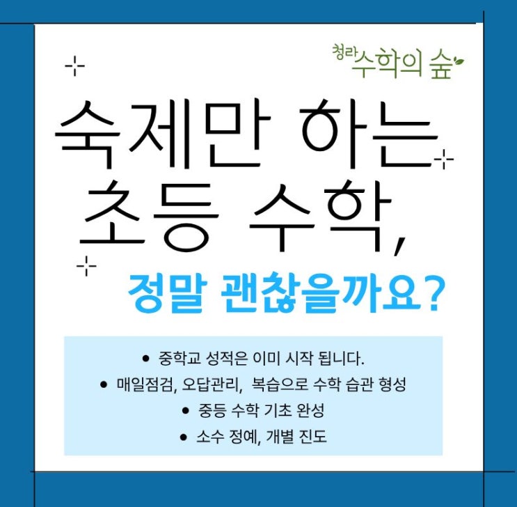 “우리 아이, 숙제는 다 하는데 왜 수학 성적이 안 오르죠?” 초등학교 고학년 학부모님들이 가장 많이 하는 고민입니다. 단순히 문제를 푸는 것만으로는 수학 격차가 생기기 시작합니다. 숙제만 하는 수업의 한계 초5·초6 과정에는 ✔ 약수·배수, 분수·소수 ✔ 비율과 비례, 평균과 자료 같은 중등 수학으로 바로 연결되는 핵심 단원이 많습니다. 이 단원들은 단순 계산만 반복한다고 성적이 오르지 않습니다. 숙제를 다 했다고 해서 개념이 정확히 이해되었는지 틀린 문제를 다시 반복하지 않는지 오답이 쌓이지는 않는지 이 부분은 점검되지 않습니다. 결국 중학교에서 흔들리는 수학 실력이 만들어집니다. 학습 관리가 필요합니다 초등 고학....... <img src="https://blogthumb.pstatic.net/MjAyNjAyMTFfMjQ0/MDAxNzcwODAwMDYxODE3.KrNprvpWOpshRCF5AoBKgTuY1dAnuyETcL-Dzm8KFXIg.Yizks40ovRua3qATNgCcGrBeRFVxloNDVrw81FhmWcsg.JPEG/%C1%A6%B8%F1%C0%BB_%C0%D4%B7%C2%C7%D8%C1%D6%BC%BC%BF%E4._%2830%29.jpg?type=s3" />