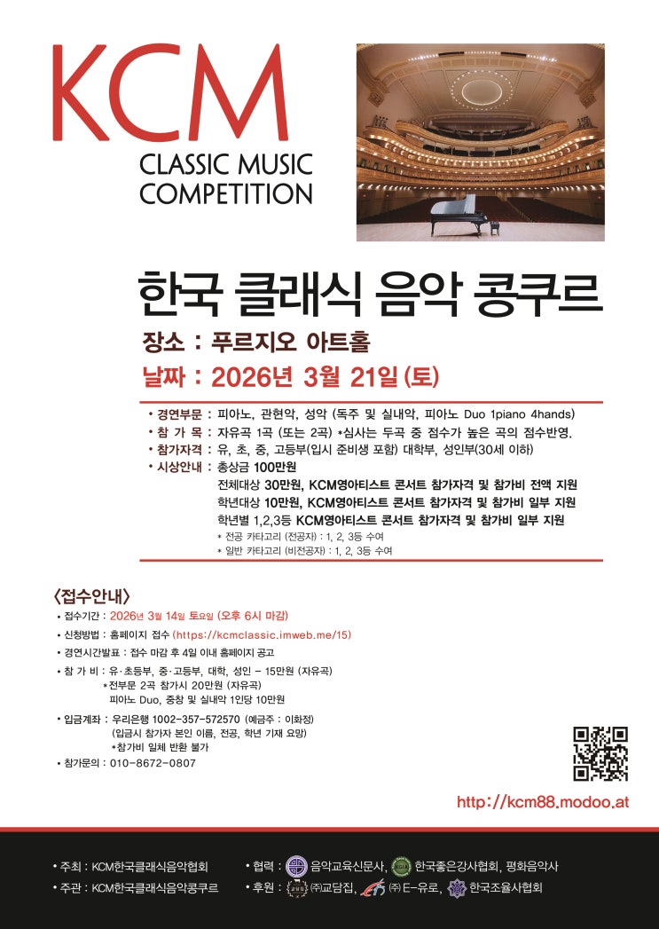 2026 KCM한국클래식음악콩쿠르 요강 일시: 2026년 3월 21일(토요일) 장소: 푸르지오 아트홀 경연부분: 피아노, 현악, 관악, 성악 (독주 및 실내악,피아노 Duo 1pian 4hands) 참가곡: 자유곡 1곡 (또는 2곡) *심사는 두곡 중 점수가 높은 곡의 점수반영 참가 자격: 유, 초, 중, 고등부(입시준비생 포함) 대학부, 성인부(30세 이하) 시상안내 : 총상금 100만원. KCM영아티스트 콘서트 참가자격 및 참가비 지원 * 전체대상: 상금 30만원, KCM영아티스트 콘서트 참가자격 및 참가비 전액 지원 * 학년대상: 상금 10만원, KCM영아티스트 콘서트 참가자격 및 참가비 일부 지원 * 학년별 1,2,3등 KCM영아티스트 콘서트 참가자격....... <img src="https://blogthumb.pstatic.net/MjAyNjAyMThfOSAg/MDAxNzcxNDIzMzQ0NTQx.agAxzWTDZMSi2GvlBDuetzCz5B0GX-YxOEIfJJ4uahkg.urLoaitse0enkahlCc2BR2LRQZxXwfWIRfNI_b0S_zsg.JPEG/2026KCM%C4%E1%C4%ED%B8%A3.jpg?type=s3" />