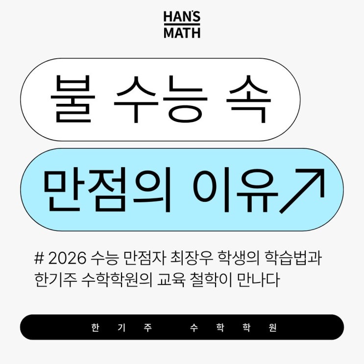 안녕하세요~ 언제나 정성을 다하는 30년 수학교육 전문 한기주 수학학원입니다! 2026 수능 만점자 최장우 학생의 학습법과 한기주 수학학원의 교육 철학이 만나다 ※교과서를 중심에 두되, 생각하는 힘을 키우다 최장우 학생은 교과서는 어디까지나 수능의 기본 시험 범위이며, 모든 문제의 출발점이라고 말한다. 다만 교과서만으로는 충분하지 않기에, 기출문제를 통해 문제를 바라보는 다양한 시각과 풀이의 스킬을 익히는 과정이 반드시 필요하다고 말한다. 이는 한기주 수학학원이 강조해온 방향과 맞닿아 있다. 한기주팀 역시 개념이 문제 속에서 어떻게 활용되는지, 왜 이런 조건이 붙는지 사고하게 만드는 수업을 목표로 한다. 문제를 많....... <img src="https://blogthumb.pstatic.net/MjAyNTEyMTlfMTgg/MDAxNzY2MTI1OTA1MDM2.AXWvTPYYMsHTzIB4O8FhFx-TFACDEDohT5px3MtILtkg.3qM6fbRZcp6QbGlqwMmSlNtQGJ7Gv1piPi-87a7mpDog.JPEG/1.jpg?type=s3" />