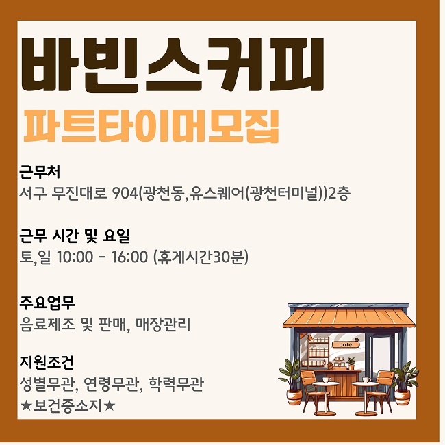 안녕하세요. 광주커피바리스타학원입니다. 바빈스커피에서 주말 파트타이머를 구하고 있어 안내 해 드립니다. 근무요일 : 토,일 근무시간 : 10:00~16:00 (휴게시간 30분) ✅지원조건: 학력무관, 성별무관, 연령무관 ⭐보건증⭐있는 사람만 지원가능! ✅업무내용: 음료제조 및 판매, 매장관리 구인공고 관심 있으신 분들은 위 공고 클릭해서 내용 확인 후 온라인지원, 간편문자지원 하시면 됩니다 :) 빠르게 마감될 수 있으니 서두르시기 바랍니다~ <img src="https://blogthumb.pstatic.net/MjAyNjAzMDNfMTUy/MDAxNzcyNTA4MDk4Mjg3.kSqAKLmjbV10wUFdTSGx6pEbWW09SUalW_e7asrD8qkg.FE9FkcDHQF9UkBabj3toWwOus83LYpap9JMxHFxSbFog.JPEG/26%B3%E23%BF%F9%B9%D9%BA%F3%BD%BA%C4%BF%C7%C7.jpg?type=s3" />
