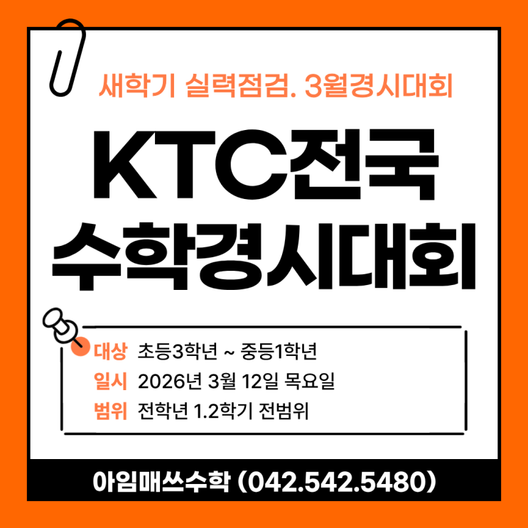 안녕하세요. 아임매쓰수학입니다. 3월 새학기를 맞이하여 KTC 전국수학경시대회를 실시합니다. 시험 일정은 3월 12일이며, 이번 시험은 전 학년 전 범위로 진행됩니다. 새로운 학년을 시작하는 이 시점에 전 범위 시험을 실시하는 이유는 매우 분명합니다. 수학은 단순히 한 단원만 잘한다고 해서 실력이 완성되는 과목이 아니라 이전 개념이 차곡차곡 쌓여야 하는 누적형 과목이기 때문입니다. 따라서 새학기를 시작하는 시점에서 지난 학습 내용을 다시 한번 점검하는 과정은 매우 중요한 의미를 갖습니다. ▶자신의 현재 실력을 객관적으로 확인하며 ▶앞으로의 학습 목표를 설정할 수 있습니다. 특히 전국 단위로 진행되는 경시대회는 학생들....... <img src="https://blogthumb.pstatic.net/MjAyNjAzMDdfNTAg/MDAxNzcyODIwMzU2MDYx.dKS59k6RogQeiOm3cKj_DgpjrTrC1SB9OZ3QL_Jzdn4g.dXKsR7PJ8ZA5NqNfeANpqTTJ9V91Gn_qdp9flgoiXxsg.PNG/%B0%E6%BD%C3%B4%EB%C8%B83%BF%F9.png?type=s3" />