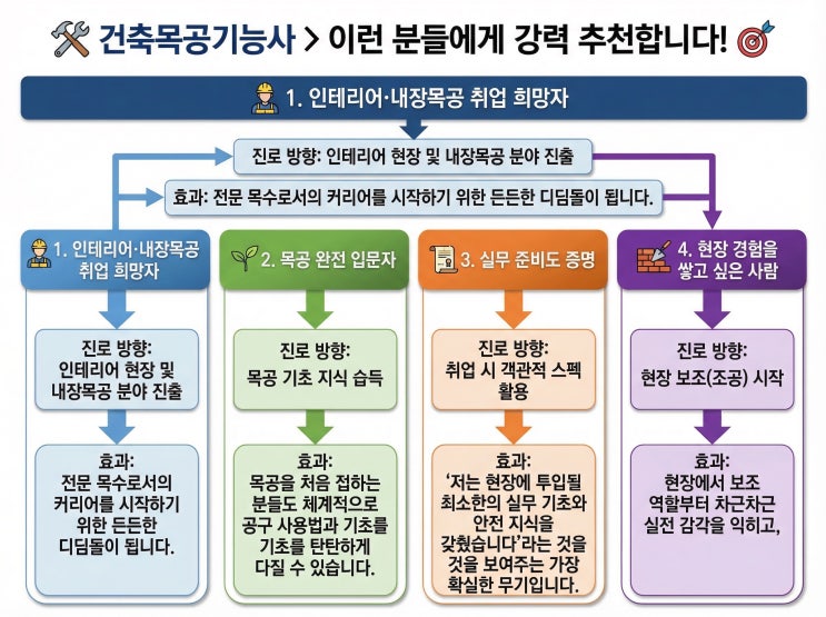 건축목공분야에 입문하시려는 분들에게 중요한 관심 중 하나가 자격증취득에 관한 부분입니다. 그리고 상담하시는 분들 중 많은 분들께서 계속 햇갈려하시는 부분이기도 합니다. 이번 글에서는 어떤 자격증이 있고 어떻게 활용이 되는지 궁금하신 분들을 위한 정리를 좀 더 쉽게 설명 해드리겠습니다. 목공 분야에 관심이 생기면 가장 먼저 떠오르는 질문이 있습니다. “자격증은 어떤 걸 따야 하지?” “건축목공기능사랑 산업기사는 뭐가 다르지?” “가구제작기능사는 또 다른 분야인가?” “과정평가형은 일반 시험이랑 뭐가 다른 거지?” 처음 이 분야를 접하는 분들에게는 이름부터 비슷해서 헷갈리기 쉽습니다. 오늘은 건축목공 관련 자격....... <img src="https://blogthumb.pstatic.net/MjAyNjAzMTZfMTk1/MDAxNzczNjQ2MDcwOTY3.4oddKCsytqrx-pO8ZzCGlhik3TnS6mac0rAm50lL0Q4g.HNpBg7ASoQRz7k1hNjtoPR8LZhFmo9YcAxIf4ZNbrjwg.JPEG/AIDrawing_260316_46595c8e-c9d5-48ba-94c1-76f64f5ebe4c_0_MiriCanvas.jpg?type=s3" />