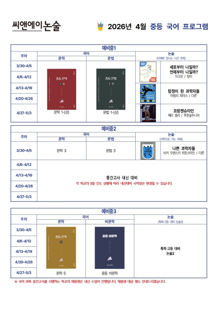 안녕하세요 판교C&A논술학원입니다. 판교C&A논술 4월 중등부 독서+국어 투트랙 프로그램을 소개합니다! 4월 중등 국어·논술 프로그램 (3/30~5/3) 판교C&A논술 국어 실력, 지금부터 완성합니다! 판교C&A논술 2시간 국어(문법·문학) 수업 + 1시간 독서논술 수업, 총 3시간 동안 깊이 있는 국어 수업을 진행합니다. 탄탄한 국어 실력, 지금 시작하세요. 중등 전 과정 맞춤 커리큘럼 중등 자체제작 교재! 판교C&A논술학원에서는 자체 제작 교재로 수업을 진행합니다. 판교C&A논술학원은 고등국어학원인 '깊은샘 국어학원'을 운영하고 있으며, 중등부 학생들은 내신뿐 아니라 수능 대비를 위한 국어 강화....... <img src="https://blogthumb.pstatic.net/MjAyNjAzMTJfNDcg/MDAxNzczMjg5NDk4OTk4.d1Y8Bwpzba1sK1tLrsBoSzhhnZqTNHV3g-4jurkZcSog.upJOLcN8PDYkodjUwCizaKPgPaemQxEiHrJ64HNiocwg.JPEG/2026%2B4%BF%F9%2B%C1%DF%B5%EE%2B%BC%B1%C1%A4%2B%B5%B5%BC%AD%28%C0%CC%B9%CC%C1%F6%EA%F3%29_-_%B0%D4%BD%C3%BF%EB001.jpg?type=s3" />