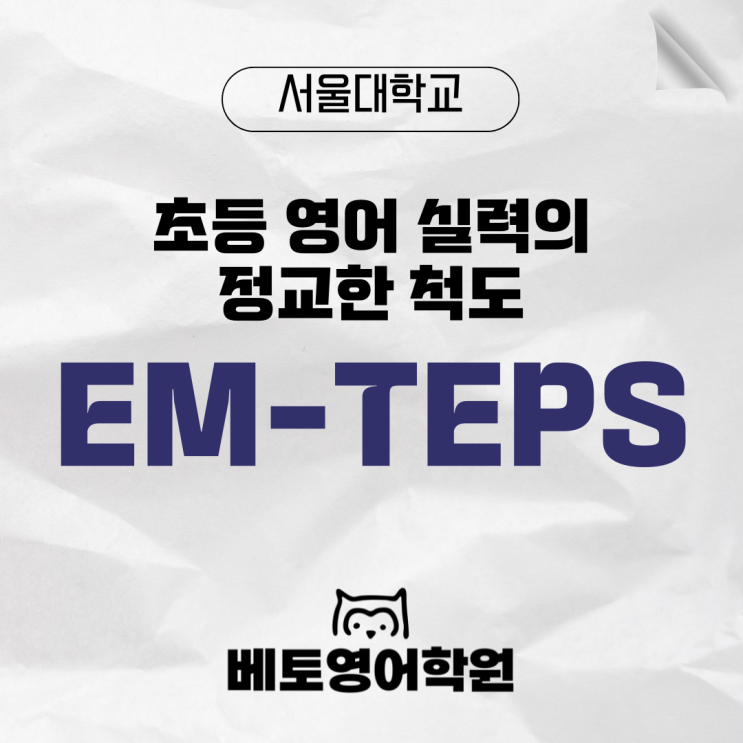 안녕하세요 :) 분당 영어학원의 자존심을 지키는 베토영어학원 입니다. 베토영어는 그동안 서울대학교에서 개발된 영어 평가 시스템과 꾸준히 인연을 이어오고 있습니다. 현재 IM-TEPS iBT 시험 운영 기관이기도 하며, 서울대학교 기술지주회사에서 개발한 AptiFit 적성 진단 프로그램을 교육 현장에서 실제로 활용하고 있습니다. 이러한 경험을 바탕으로 베토영어는 2026년 3월 EM-TEPS 공식 도입에 앞서 파일럿 시험을 참여합니다. 그래서 오늘은 새롭게 시작되는 영어 평가인 “EM-TEPS(Elementary-TEPS)”가 무엇인지 간단히 소개해보려고 합니다. - 새로운 영어 평가의 시작, EM-TEPS - 초등 영어 실력의 정교한 척도, EM-TEPS “교육부 교....... <img src="https://blogthumb.pstatic.net/MjAyNjAzMTJfODgg/MDAxNzczMzA1MDgzMTQw.6aoc0Ll8iABvGjBDfb4g3hYQTbWLnBrAsMaVKY2_9pMg.uICse3r0J051s_CX2zrq_XHpxnuKH-2iBlee3WEL3oUg.PNG/%BC%BC%BA%EA%B6%F5%BD%BA_%C3%DF%C3%B5%B5%B5%BC%AD_%C1%DF_%A5%B4.png?type=s3" />