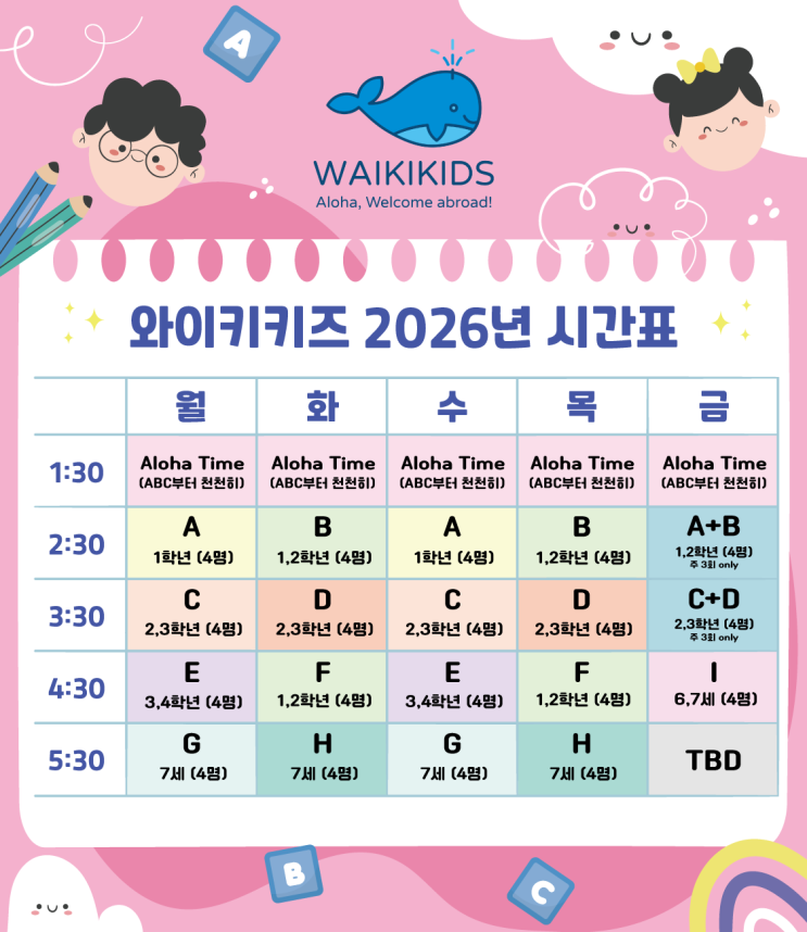 지축 초등영어 어린이영어 7세 8세 9세 알로하! 지축 놀이 영어 와이키키즈입니다 어느덧 3월, 설레는 신학기가 코앞으로 다가왔습니다. 사실 더 일찍 시간표를 공유해 드렸어야 하는데, 감사하게도 기존 재원생분들과 신규 대기자분들의 성원에 힘입어 대부분의 클래스가 공지 전부터 빠르게 마감되었습니다. (진심으로 감사드려요!) 기다려 주신 분들을 위해, 현재 등록 가능한 최종 잔여석을 안내해 드립니다. 2026년 신학기 정규 시간표 (March Semester) ⚠️ 현재 예약 가능한 잔여석 (실시간 업데이트) A 클래스 (초등 1학년): 잔여 1석 ♂️ B 클래스 (초등 1학년): 잔여 1석 ♀️ (나머지 C~H 클래스는 모....... <img src="https://blogthumb.pstatic.net/MjAyNjAzMDlfMjgw/MDAxNzcyOTgyMTMzMjEx.k5490GDoAZ3qQCbnzN7AuGEIB2GhS5g8t5_xQpsRwN8g.fiOCVT2DJ0Z-7Shk4egp3B_vJQIWfYH81oteB7BpUQcg.PNG/26%B3%E2_%BD%C3%B0%A3%C7%A5.png?type=s3" />