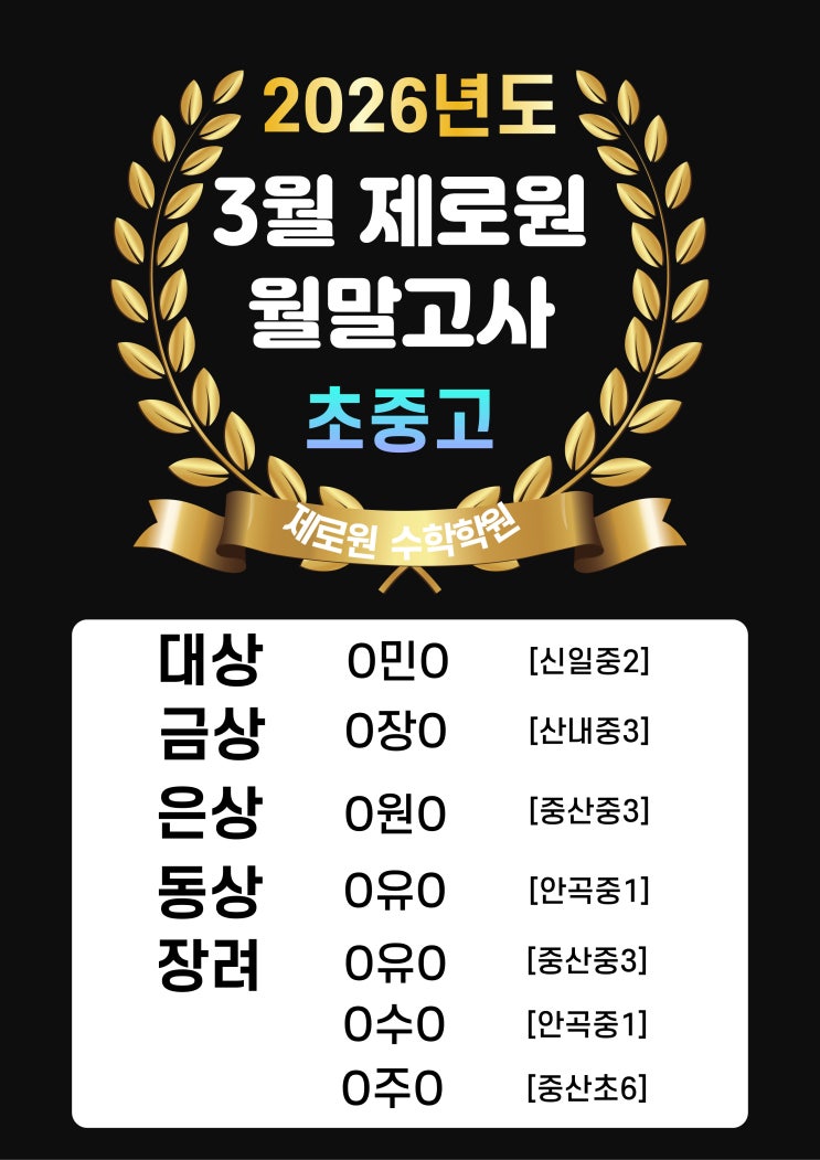 3월 18일(수), 3월 19(목), 3월 20일(금) 3일간 치러진 월말고사 우수자 수상입니다. 위학생들에겐 도서문화상품권이 지급됩니다. 축하드립니다^^ <img src="https://blogthumb.pstatic.net/MjAyNjAzMjJfMTYw/MDAxNzc0MTA5MjI0Mzg0.YnptRrqaNrl5J1_sJNmEKYsGCQwsVQQVsUTZq7y_DB0g.SYug_My9gI4uz0ZaMFiRj8ENtBzTZryXkAHB5YRceBcg.JPEG/%C1%A6%B8%F1%C0%BB_%C0%D4%B7%C2%C7%D8%C1%D6%BC%BC%BF%E4._%2812%29.jpg?type=s3" />