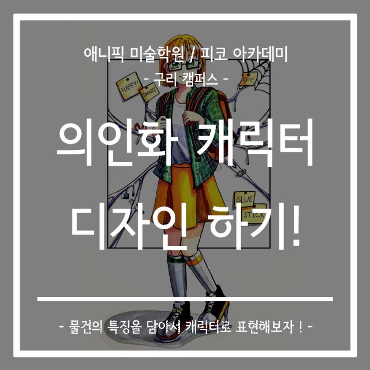 안녕하세요! 구리 상봉 미술학원 / 망우 만화 학원 애니픽 미술학원 피코 아카데미입니다~ 이제 새 학기가 시작되었습니다! 우리 친구들 오랜만에 학교 잘 다녀왔나요~~ 다시 열심히 달려볼 때가 왔습니다. 새 학기가 시작인 만큼, 새로운 마음가짐으로 시작해 봅시다♥♥ 오늘 소개할 수업은 <물건 의인화>입니다! '의인화'에 대해서 알고 계시나요? 의인화는 '사람이 아닌 것을 사람으로 표현하는 것'입니다. 이 대상은 무생물(지우개, 연필 등)일 수도, 살아있는 생명체(강아지, 장미 등)가 될 수도 있죠! 의인화를 하는 이유는 이들이 가진 특징을 강조하여 캐릭터로 표현하는 법을 배우거나, 보다 더 친근하게 느....... <img src="https://blogthumb.pstatic.net/MjAyNjAzMDRfMjkz/MDAxNzcyNjA1MzY4NTgx.CW9_98u56g_Zms5cCqmaKgcY9vU0f-U96Qjy3dOMlEgg.TPulDuGNK2lVErCZ9q-21Bpk2PCBtYeRKs8yCdVXda4g.JPEG/0304_%B4%EB%C7%A5%C0%CC%B9%CC%C1%F6.jpg?type=s3" />