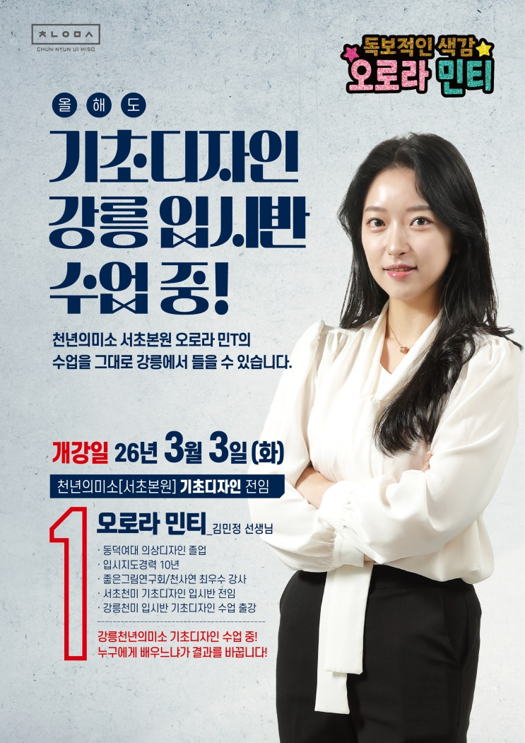 2026년 붉은말의 기운으로 힘차게 달려 봅시다!!! 올해도 강릉천년의 미소 기초디자인은 오로라 민T와 함께합니다~^^ 미대에 대한 바른 고민 강릉 천년의미소 미술학원 <img src="https://blogthumb.pstatic.net/MjAyNjAzMDlfMjE1/MDAxNzczMDU3OTI1MDQx.Y9rY3wEilc-LZGeFy7cp6luofitLzUKvgSmRyZrpkswg.l-EKMzNxmv-eMgjcpxXuGU5_04NyObMJYnHSdiXzhq8g.JPEG/2026-%B9%CE%C1%A4%BB%F9_%BC%F6%BE%F7_%C6%F7%BD%BA%C5%CD01.jpg?type=s3" />