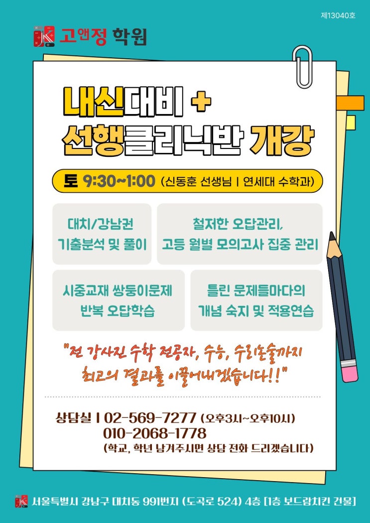 안녕하세요, 우리 아이들의 수학적 성장을 책임지는 고앤정학원 입니다. 수학은 단순히 문제를 많이 푸는 것이 아니라, 정확한 개념을 바탕으로 고난도 문제에 적용하는 힘을 기르는 것이 핵심입니다. 전 강사진 수학 전공자로 구성된 저희 학원에서 수능과 수리논술까지 아우르는 압도적인 실력 차이를 경험해 보세요. 1. 매주 토요일, 몰입도 높은 '내신 & 선행 클리닉' 평일 학습의 부족함을 채우고 다음 단계로 도약하기 위한 토요일 집중 클래스를 운영합니다. 내신 등급을 결정짓는 킬러 문항 정복부터 탄탄한 선행 학습까지, 한 번에 해결합니다. 2. 대치·강남권 기출 분석 및 실전 풀이 상위권으로 가기 위해서는 검증된 자....... <img src="https://blogthumb.pstatic.net/MjAyNjAzMTJfMTgz/MDAxNzczMzIwMTc0NTEy.DFXdbmekMRc82GBVhsYWEF_EjMSfmzGB3_0xgPmxSxYg.BQJ7Vyo96CTw4TkKELXYCEQ8aCqVQhpGHwaEDpwVma8g.JPEG/%28%C5%E4%29_%B3%BB%BD%C5%B4%EB%BA%F1%2B%BC%B1%C7%E0%C5%AC%B8%AE%B4%D0%B9%DD_%281%29.jpg?type=s3" />