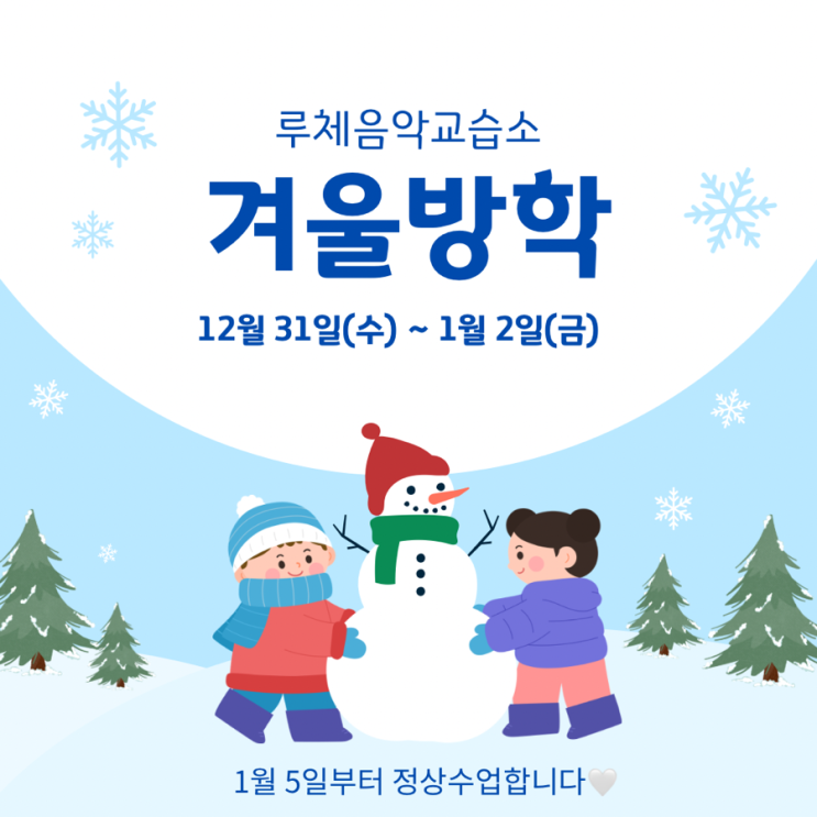 안녕하세요^^ 루체음악교습소 겨울방학 안내입니다. 저희 원은 12.31(수) ~ 1.2(금)까지 총 2일간 진행합니다. 좋은기운으로 레슨에 임할수있도록 건강하게 재충전하고 1.5(월)부터 정상수업이 시작하겠습니다 감사합니다 <img src="https://blogthumb.pstatic.net/MjAyNTEyMTVfMTEy/MDAxNzY1NzU1MzcyMDMy.TYgOs79uFbw1SgdixPRhELwD7upmQOdzEL1hWezYHq8g.SkMj9BFAxbaj_2w9O9ohsg7QZjXifKflPHVfAn8Ccccg.PNG/IMG%A3%DF6344.PNG?type=s3" />