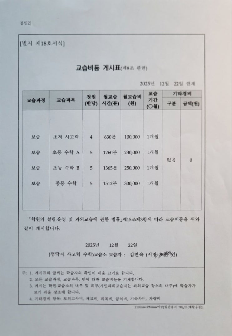 초등 - 60분 * 4 회 ( 4주) = 190000 초등 - 90분 * 3회 ( 4주) = 212000 중등 - 150분 * 2회 (4주) = 254000
