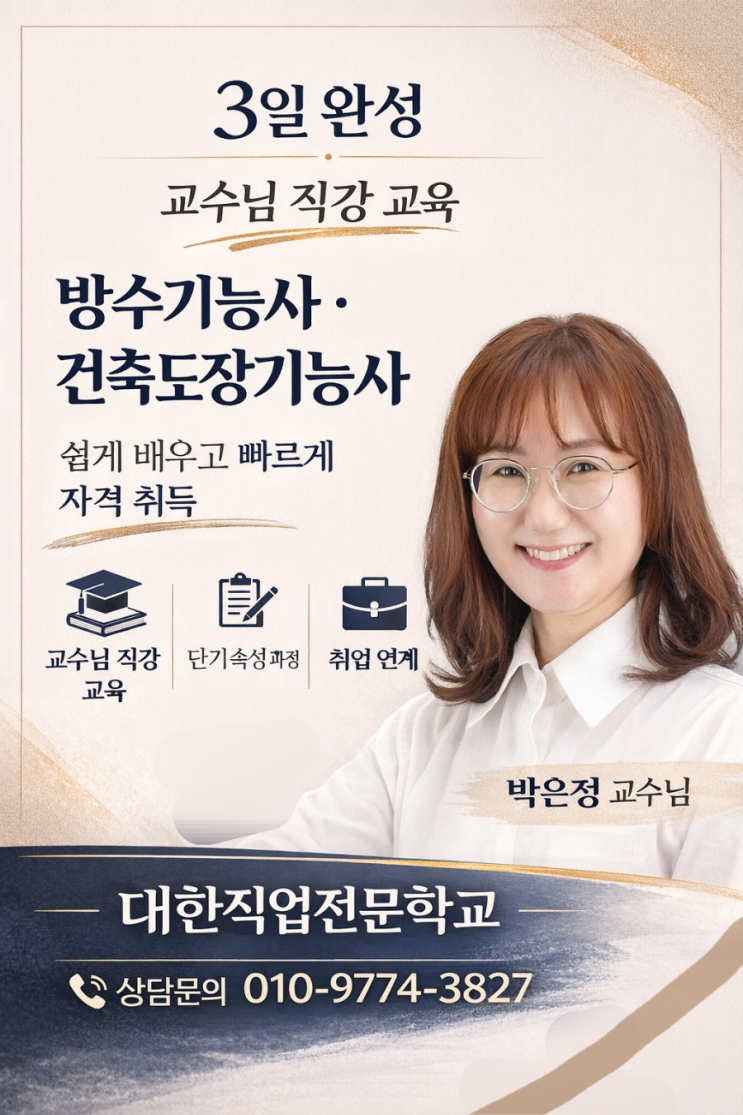 새로운 기술은 새로운 인생의 시작입니다. 지금의 선택이 내일의 경쟁력이 됩니다. 늦었다고 생각할 때가 가장 빠른 출발입니다. 배우는 순간, 기회는 이미 시작됩니다. 오늘의 도전이 평생의 자격이 됩니다. 안녕하세요, 대한직업전문학교입니다. 연일 이어지는 비 소식에 하루가 조금은 느리게 흐르는 요즘입니다. 촉촉한 날씨 속에서도 새로운 도전을 준비하시는 모든 분들을 응원합니다. 건강 유의하시고 오늘도 의미 있는 하루 보내시길 바랍니다. 대한직업전문학교는 여러분의 새로운 시작을 함께하겠습니다. 3일 완성 건축도장기능사 · 방수기능사 과정 모집 실무 중심 교육으로 빠르게 자격증 취득이 가능한 과정 대한직업전문학교에서 실....... <img src="https://blogthumb.pstatic.net/MjAyNjAzMDJfMTcz/MDAxNzcyNDUwNjQ2NjY4.1Vl4wKicFXpBG7V0GdV1var_61nuli_XXT059fay4LUg.mKR_RoceM658tv-Hy7fXysrKdD6e3kIY3sWQCLc6jaAg.PNG/900%A3%DFfile%A3%DF000000007f5c71faae11e388514cffba.png?type=s3" />