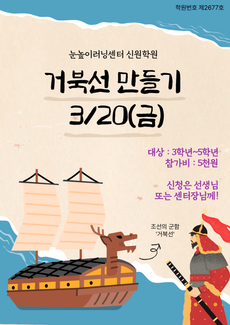 안녕하세요 신원학원입니다. 원데이클래스 2탄이 돌아왔습니다! 이번 주제는 따서 조립하는 <거북선 만들기> 입니다. 거북선은 어떤 구조로 만들어졌는지, 무거운 배가 어떻게 물 위에 뜰 수 있는지 등을 배워보는 시간을 가져볼 거예요 대상 : 초등3~5학년 일시 : 3월 20일(금) 2시 (*상황에 따라 시간이 변경될 수 있습니다.) 참가비 : 5천원 신청은 각 담당 선생님 또는 학원으로 연락주세요! 눈높이 러닝센터 신원학원(제2677호) -동산장로교회 왼편 3분 거리 -02-865-9090 -또는 카카오톡에서 '눈높이러닝센터 신원학원' 검색하시고 채팅 보내주세요^^ 네이버로 상담 예약 가능! <img src="https://blogthumb.pstatic.net/MjAyNjAzMDRfNjcg/MDAxNzcyNjA2NDIyODg2.OtH7uZ_GeBoO0aXEv6miwIzJYWobvbUY6M0N78DBLeAg.JCfcfS09dOswMi923ZSsqqr4Ugr8Px0X0xOkicLszuQg.PNG/%B0%C5%BA%CF%BC%B1_%B8%B8%B5%E9%B1%E2.png?type=s3" />