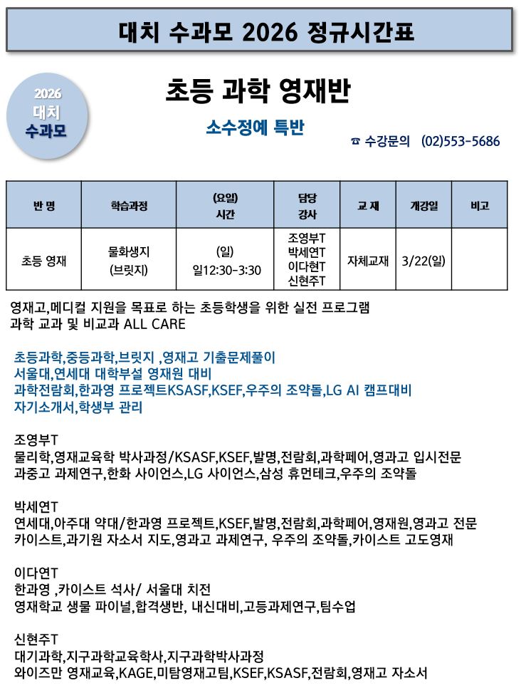 파워영재학원의 수업 특징 1️⃣ 교과 중심 수업 학교 진도에 맞춘 수업으로 개념 이해부터 유형 문제, 내신 대비까지 체계적으로 학습합니다. 데이터를 분석하는 전용 플랫폼을 이용하여 학생들 관리 2️⃣ 선생님과 진도 맞춤 수업 학생마다 이해 속도와 학습 수준이 다르기 때문에 획일적인 진도가 아닌 학생별 진도 조절이 가능합니다. 3️⃣ 철저한 오답 관리 수학 실력 향상에서 가장 중요한 것은 틀린 문제를 제대로 분석하고 다시 풀어보는 과정입니다. 파워영재학원에서는 오답 노트와 반복 학습을 통해 학생들이 같은 실수를 반복하지 않도록 지도합니다. 4️⃣ 소수정예 집중 관리 한 반 인원을 제한하여 선생님이 학생 한 명 한....... <img src="https://blogthumb.pstatic.net/MjAyNjAzMTFfMTY3/MDAxNzczMjA4Mjc5NzQ1.SUTT1OrFR_3pUOmZIQCrkeQlD_5Wv8OqRI9P00KdMNMg.UlMywa-BKeT0u-0CiZhr_KKTRAkqQsjueLYj0XB6Dh8g.JPEG/%BF%C0%B4%E4.jpg?type=s3" />