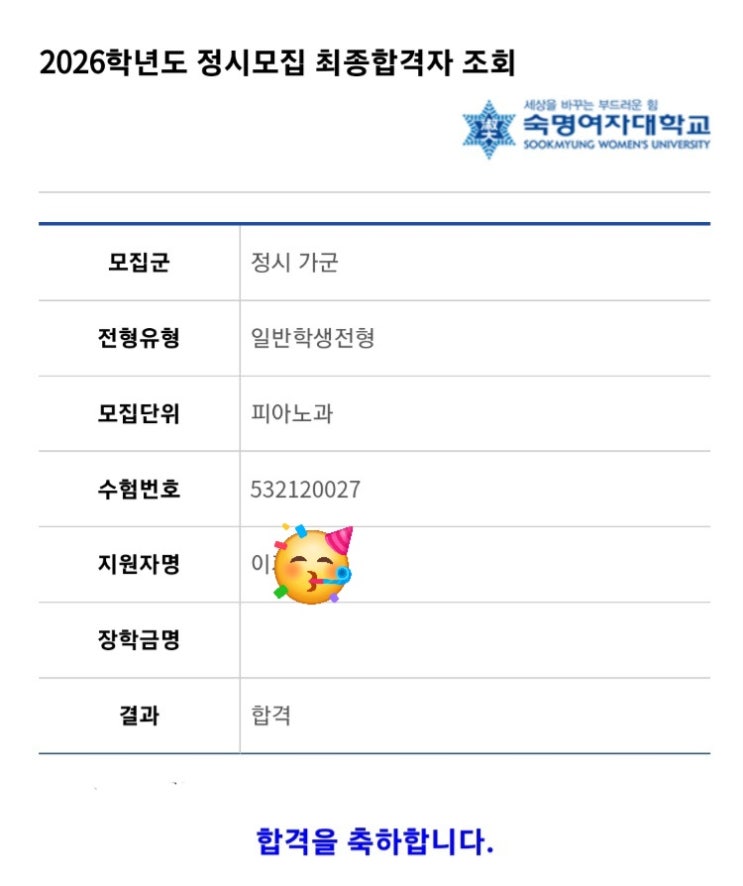 고2때부터 가르쳤던 이*원 학생이 2026년 숙명여대 피아노과 정시에 합격했습니다. 너무너무 축하해~~♡♡ 대학에서 더 큰 꿈을 꾸기 바라며.. 화이팅~~!! #가락초피아노 #헬리오시티음악학원 #해누리초피아노 #헬리오시티피아노학원 #헬리오시티바이올린 #스즈키바이올린 #헬리오시티첼로 #헬리오시티플룻 #헬리오시티클라리넷 #가락초오케스트라 #예중예고입시 #음대입시 #예원피아노입시 #피아노학원 <img src="https://blogthumb.pstatic.net/MjAyNjAzMDJfMTgz/MDAxNzcyNDYwOTIxMDc4.m61swXwuahUIyQr8D9cH7B1OKe4gBFXkRR27824n0FEg.vzSrArB9_BcnpmVMAEHodvH_eufN1X9Jjxy2eDqzL5Mg.JPEG/1769471433423.jpg?type=s3" />