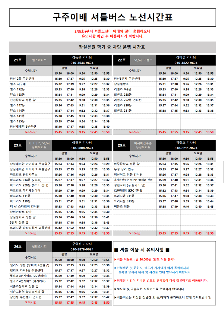 안녕하세요, 구주이배 잠실본원입니다. 3/3(화)부터 학기 중 운행되는 셔틀 노선 시간표 안내입니다. ※ 일요일 및 공휴일 미운행 첫 등원 시 반드시 기사님과 통화하시어 정확한 탑승 위치 및 시간 확인 후 이용 바라며, 정차시간 3~4분 전부터 잘 보이는곳에서 대기하여주시기 바랍니다. 궁금하신 사항은 학원으로 문의하여주시기 바랍니다. 고맙습니다. [상담 및 문의] ☎ 02-423-9624 <img src="https://blogthumb.pstatic.net/MjAyNjAzMDJfMjM2/MDAxNzcyNDQxMTAwMDI1.ktwRQ8ixXJvfSGALfBBhou9xOI40UuqO16DXPNnwTfIg.QQDZQKPSTk5HXcoi8HhUuD2RTfON4Exg4jrGW92GX6Ig.PNG/2026_%C7%D0%B1%E2%C1%DF_%BC%C5%C6%B2_%B3%EB%BC%C7%C7%A5_%B7%A1%B9%CC%BE%C8%BE%C6%C0%CC%C6%C4%C5%A9_%C3%DF%B0%A1.png?type=s3" />