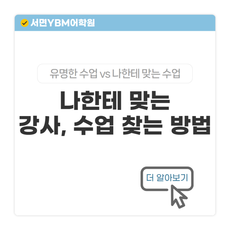 안녕하세요! 서면 YBM입니다 토익학원을 알아보시는 분들 중 생각보다 많이 듣는 질문이 있어요 (*˘▿˘✽) "제일 인기 많은 수업이 뭐에요?" "여기 유명한 강사님은 어느 분이신가요?" 물론 듣고싶은 수업 강사님의 인지도나 유명세도 중요한 선택 기준이 될 수 있지만, 실제로 점수를 올리는 데 있어서 중요한 것은 나에게 맞는 수업과 강사님을 찾는 것입니다! 오늘은 유명한 강사 vs 나에게 맞는 강사, 어떤 기준으로 선택하면 좋을지 소개해 보겠습니다 수강생마다 현재 실력과 목표 점수, 공부 경험이 모두 다르기 때문에 커리큘럼은 550+반부터 850+반까지 다양하게 선택 가능합니다! 550+, 650+반 : 토익이 처....... <img src="https://blogthumb.pstatic.net/MjAyNjAzMTFfNDQg/MDAxNzczMjA2MDczOTcy.aOkUYiMtWf4NJ1vsHoGXw2abZE2nBRlMarul1pORuXcg.BsS6UVyte8aNG9OuTLl7NpMsEAoq3g-OuSetTnXYvBsg.PNG/%BA%ED%B7%CE%B1%D7_%B4%EB%C7%A5%BB%E7%C1%F8%BF%EB_%2812%29.png?type=s3" />