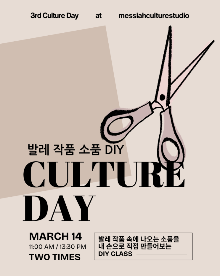 안녕하세요 메시아컬쳐스튜디오입니다 아름다운 발레 작품을 더욱 빛나게 해주는 건 무엇일까요? ✨ 바로 ‘소품’입니다 ✨ 발레 공연을 보며 “나도 저렇게 발레리나처럼 춤춰보고 싶다” 생각해 본 적 있으신가요? 이번 컬쳐데이에서는 무대 위 주인공이 되어 발레 작품 속 소품을 직접 만들어보고, 감성 가득한 포토존에서 발레리나처럼 인생샷도 남길 수 있는 특별한 하루를 경험하실 수 있습니다 예술과 함께하는 즐거운 시간, 메시아컬쳐스튜디오에서 만나보세요 ✨ - ✂️ 3rd 컬쳐데이 - 발레 작품 속 소품 만들기 ️ 3월 14일(토) ⏰ 1타임 11:00–12:30 에스메랄다 – 탬버린 만들기 ⏰ 2타임 13:30–15:00 돈....... <img src="https://blogthumb.pstatic.net/MjAyNjAzMDlfOTMg/MDAxNzczMDMwOTIxNjIw.Oh25NOuUUOsCwzGpHLTn--XXQ1dERWUxnwbYgHeFxq4g.6QbMFWxlLn-lGZ8pyTSzYca41hC_qsgl8fpro080vyEg.PNG/1_%BA%B9%BB%E7%BA%BB.png?type=s3" />