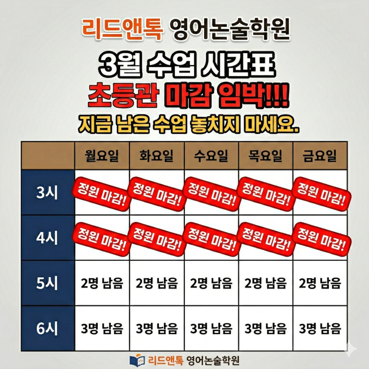 안녕하세요! 우리 아이의 확실한 영어 실력 성장을 책임지는 리드앤톡 영어논술학원입니다. 새 학기가 시작되는 설레는 3월, 학부모님들의 뜨거운 관심과 성원에 진심으로 감사드립니다. 정말 많은 분들이 문의를 주신 덕분에, 초등관 3월 시간표 중 인기 타임이 눈 깜짝할 새에 일부 마감되었습니다! 현재 남은 여석이 얼마 없어 등록을 고민 중이신 학부모님들을 위해 긴급하게 3월 시간표 현황을 공유해 드립니다. "학부모님들의 압도적인 선택, 결과로 증명합니다!" ⏰ 리드앤톡 초등관 3월 수업 마감 현황 오후 2시 타임 : 서두르세요! [단 4명 남음] 오후 3시 타임 : 꽉 찼습니다! [전 요일 정원 마감] 오후 4시....... <img src="https://blogthumb.pstatic.net/MjAyNjAzMDJfMTU2/MDAxNzcyNDU1NjI5MzU5.ludrffyozr7_7XnKIgWkgrYYYfOXgBAyI6vPgxgY-XIg.XLJmrwtZ7fs1bXFfL1mshJUtgJL4g9rfI4MJwRBAAzAg.PNG/%B8%AE%B5%E5%BE%D8%C5%E5%C1%A4%BF%F8.png?type=s3" />
