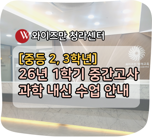 와이즈만 청라센터 재원생 26학년 1학기 중2, 3학년 중간고사 과학 내신대비 수업 안내드립니다. T반과 G반은 추가 자습시간을 활용하여 내신대비 수업이 진행되며, 문제풀이의 별도 교재가 배부됩니다. 내신반과 특강반은 정규수업 외에도 내신대비 수업을 추가로 선택하여 등원할 수 있는 시간표가 배부되며, 토요일은 문제풀이가 진행됩니다. 내신대비 이론 및 개념 수업의 경우 부득이한 사정으로 미참여시 수업 영상 링크가 제공될 예정입니다. 자세한 사항은 첨부된 안내문을 참고해주세요! [등록번호 및 학원명칭] 서부1327 와이즈만영재교육학원 서부1478 중등와이즈만CNI학원 [교습과목] 수학, 과학 [월 교습비] 초등수학 170,000 / 초....... <img src="https://blogthumb.pstatic.net/MjAyNjAzMTFfMjA0/MDAxNzczMjE3NTE2Mzc0.c2RULhy7bS74Mk5LkkIXFt2p3xp_1neVS5P-HlozPqIg.qwP2ZICL5Ak9IzFDCLNylGpXiFoVr1BuRF9UbUbadj0g.PNG/%BA%ED%B7%CE%B1%D7-%BD%E6%B3%D7%C0%CF-%BE%E7%BD%C42-001.png?type=s3" />