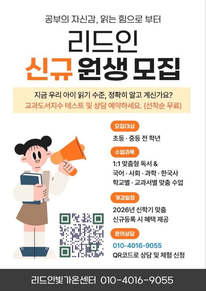 2026학년도 신입 원생을 모집합니다. 새학년, 새학기 공부의 자신감은 읽기능력과 문해력으로부터 나오는 거에요. 상담의 문은 언제든 열려 있으니까 리드인 빛가온센터로 오세요. <img src="https://blogthumb.pstatic.net/MjAyNjAzMDNfOTYg/MDAxNzcyNDkwNzM3MjE0.frIwgXDlWZ6U9dVMf9zuTQDq24ht9bEgD42uMcYRul4g.1AlApFn7ItUovRa0SObRLD9aywFObmv47D7oetUNHG4g.JPEG/1772490358401.jpg?type=s3" />