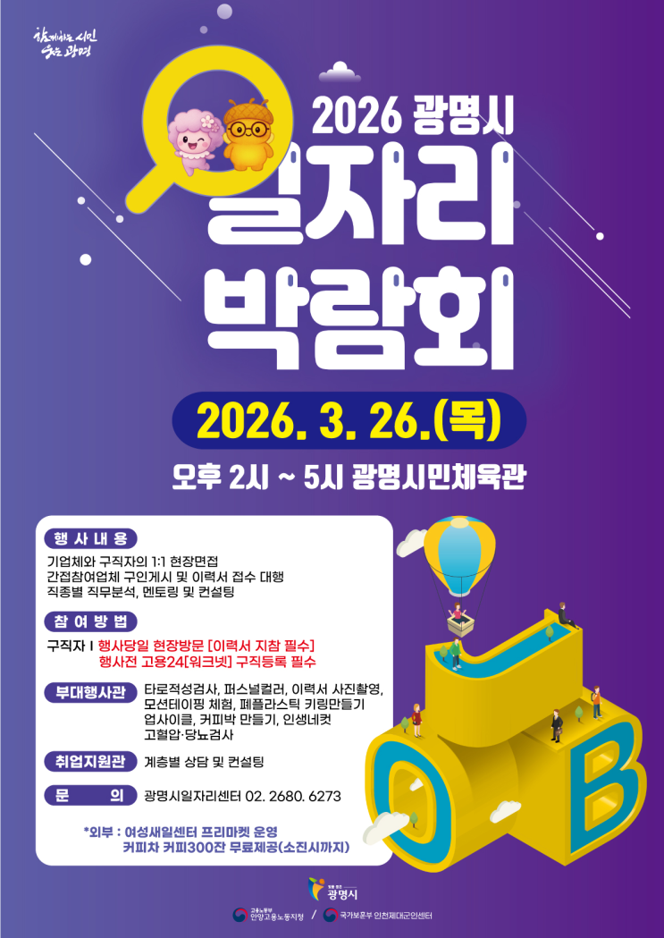 [2026년 광명시 일자리 박람회 개최 안내] (행사개요) - 일 시 : 2026. 3. 26. (목) 14:00~17:00 - 장 소 : 광명시민체육관(광명시 오리로 703) - 내 용 : 1:1면접 채용관, 부대행사관, 체험행사 등 (참여유관기관) 광명고용복지플러스센터 노무법인 더휴먼 노무상담 및 국민취업지원제도 홍보, 광명여성새로일하기센터, 국가보훈부 인천제대군인지원센터, 한국폴리텍대학 광명융합기술교육원, 소상공인 희망 리턴패키지(소상공인시장진흥공단), 광명시정신건강복지센터(찾아가는마음세탁소), 광명보건소 고혈압 ‧ 당뇨센터 등 (부대행사) - 이력서 사진촬영, 퍼스널컬러, 타로적성검사, 인생네컷 등 (체험행사) 모션테이핑, 키링, 커피박 만들....... <img src="https://blogthumb.pstatic.net/MjAyNjAzMDRfMTc5/MDAxNzcyNTg3NjQ2ODEx.PyGTsrqP9AomcM0hbia5EBIAenmjXuwL4qTroEqK4h4g.Zg3LItC0XaDwBgTjHIjQeNkugOmXnBS3eo4FILYUzNwg.PNG/%B0%E6%B1%E2_%B1%A4%B8%ED%BD%C32026%B3%E2_%B1%A4%B8%ED%BD%C3_%C0%CF%C0%DA%B8%AE_%B9%DA%B6%F7%C8%B8_%B0%B3%C3%D6_%BE%C8%B3%BB_0304.png?type=s3" />