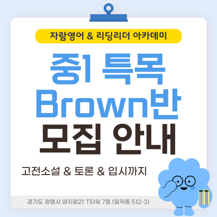 안녕하세요. Beyond the Limit Circulation & Integration Fruit of Growth 아이들의 무한한 가능성을 생각하고 언어 학습을 유기적으로 연결 통합하며, 동기부여 하는 교육을 지향하는 일직동 광명역 앞에 위치한 초중고 영어 전문 어학원 '자람영어 & 리딩리더아카데미' 입니다. 특목고를 고려하고 계시다면? 자람영어 '중등특목반'입니다. 단순 내신대비나 모의고사만을 준비하지 않습니다. 저희는 원서를 통해 풍부한 배경지식을 습득하고, 심화된 독후활동을 통해 보다 '근본적인' 역량을 늘리는 수업입니다. 오늘은 3월 개강 예정인 <중등 특목반 International Class> 'Brown레벨 (중1 ....... <img src="https://blogthumb.pstatic.net/MjAyNjAyMjdfMTcg/MDAxNzcyMTg2MjM4OTE3.dBvTuVO505pYQhB6AMbUhDqeGYWQiT4sN-gBWqPdMQwg.jFy9jxm23po0az4WBkO0xifjuMRKFatpTQ0a91m_uogg.PNG/001.png?type=s3" />