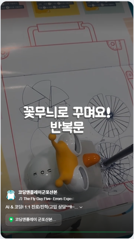 #코딩앤플레이군포산본학원, #코딩앤플레이산본센터, #군포코딩학원, #당동코딩학원, #산본코딩학원, #코딩교육, #컴퓨팅사고력, #논리적사고력, #커리큘럼, #유아코딩, #초등코딩, #신종코로나바이러스, #알버트, #산본코딩, #군포코딩, #알버트, #텔로, #ROOT, #코딩뉴스, #코딩정보, #코딩사이트, #코딩페이지, #소프트웨어정보, #소프트웨어교육, #EPL, #Scratch, #Entry, #중등코딩, #행사, #학부모, #설명회, #학부모설명회, #일상, #방역, #소독, #환기, #산본, #군포, #4차, #산업혁명, #4차산업혁명, #윈도우11, #인터넷, #진로, #루트 꽃무늬로 꾸며요! 반복문^^!! ※ 학원 관련 문의 사항 ※ T-Story https://gpcoding.tistory.com/ 인....... <img src="https://blogthumb.pstatic.net/MjAyNjAzMDlfMjY4/MDAxNzczMDMyNTYzNDky.zYYlfm03B0mxE-K06P3q7d1CZc3C0xFPIHZxEVbuRcQg.-VfrX0_-dOuw6-e8xuk6iysiYS-gerzbQPxIEuN-PIMg.PNG/image.png?type=s3" />