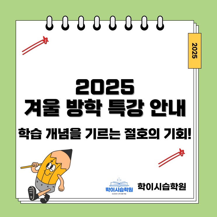 안녕하세요 성수동 학부모님들! 성수동에서 초등.중등 학생들을 대상으로 1:1 맞춤수업을 진행하는 스마트해법 영어·수학 학이시습학원입니다^^ 2025년도 어느 새 한 달도 채 남지 않았습니다. 잘 마무리하시고 희망찬 새해를 맞이하기를 바랍니다. 그리고 곧 겨울방학이 찾아오고 있네요^__^ 겨울방학은 한 학년 학습을 정리하고 다음 학년을 준비하는 결정적인 시기라는 것 알고 계시죠? 특히 영어·수학은 기초가 탄탄해야 다음 단계로 자연스럽게 올라갈 수 있기 때문에 방학 동안의 집중 학습이 무엇보다 중요합니다. 그래서 성수동 초.중등 스마트해법 영어·수학 학이시습학원에서 초·중등 학생들을 위한 겨울방학 특강을 준비했습니다! 학....... <img src="https://blogthumb.pstatic.net/MjAyNTEyMTBfMjk4/MDAxNzY1MzU2MTI1Njg3.dsVb7P1iRRubfMx-FXawno7g6zSrvaceqx_xD49wbiUg.SpSQGYBgZ_yAOJpAsqlgSfJfJ8Ru5kg84gVpUqxvDXMg.JPEG/%BA%ED%B7%CE%B1%D7%BD%E6%B3%D7%C0%CF-002_%281%29.jpg?type=s3" />