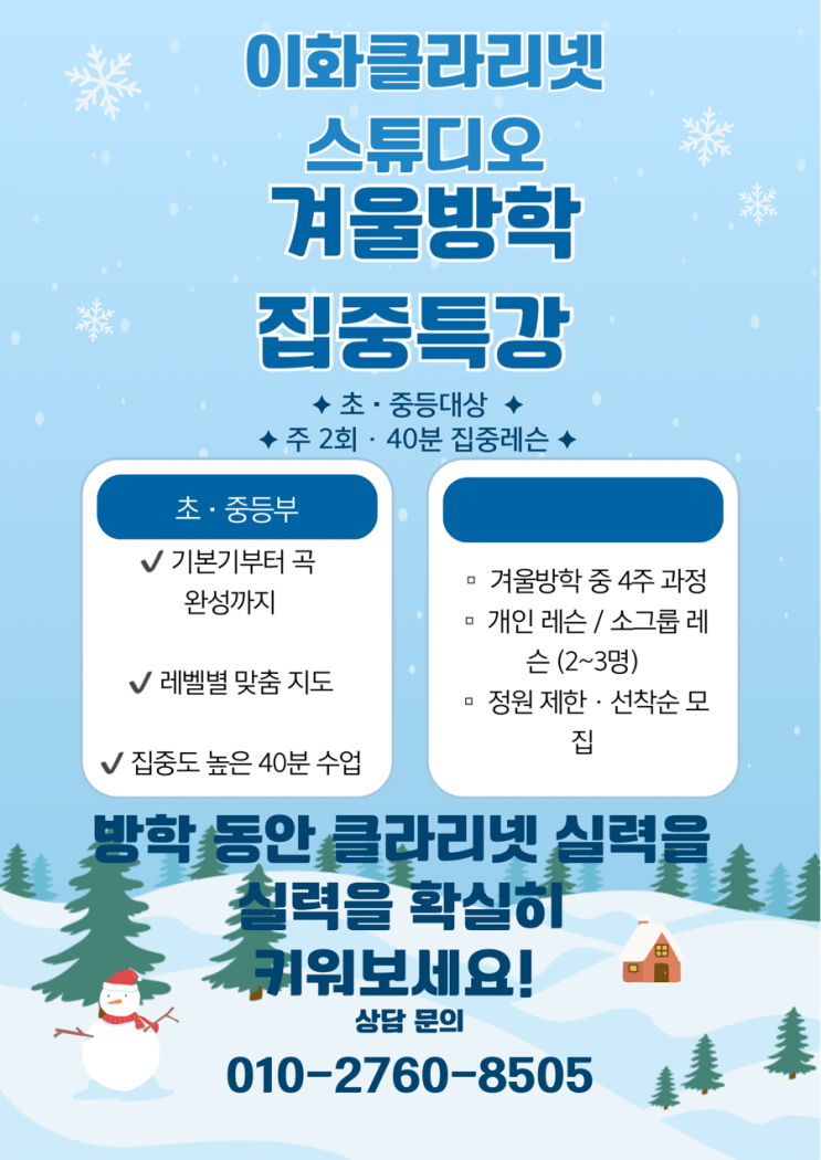 ⛄️이화 클라리넷 겨울방학 특강 안내⛄️ 겨울방학을 맞아 초·중등 학생들을 위한 집중 클라리넷 특강을 진행합니다. 이번 특강은 방학 기간 동안 ✔ 기본기 정리 ✔ 소리와 테크닉 향상 ✔ 곡 완성도 상승 을 목표로 한 주 2회 집중 레슨입니다. ▪ 대상 • 초등부 / 중등부 (레벨별 분반) ▪ 수업 형태 • 개인 레슨 또는 소그룹 레슨(2~3명) ▪ 수업 기간 • 겨울방학 중 4주 과정 • 주 2회 / 총 8회 ▪ 수업 시간 • 1회 40분 (초등 저학년은 집중도에 따라 조정 가능) ▪ 수업 내용 • 올바른 호흡과 소리 만들기 • 손가락 테크닉 및 스케일 훈련 • 레벨에 맞는 곡 완성 • 올바른 연습 방법 지도 ✔ 방학이 끝난 후에도 혼자 연습할 수....... <img src="https://blogthumb.pstatic.net/MjAyNTEyMTJfMTE5/MDAxNzY1NTQ1OTQzNjk5.hhLlzOqEhGuoGSsm0E-VuibR9_aBRfqPF4kGz7MSpdog.Sm0L5gzg6M43bP2dWOc65dxYuvTt1bI1yXx2S48z-t4g.PNG/%C0%CC%C8%AD%C5%AC%B6%F3%B8%AE%B3%DD%BD%BA%C6%A9%B5%F0%BF%C0.png?type=s3" />