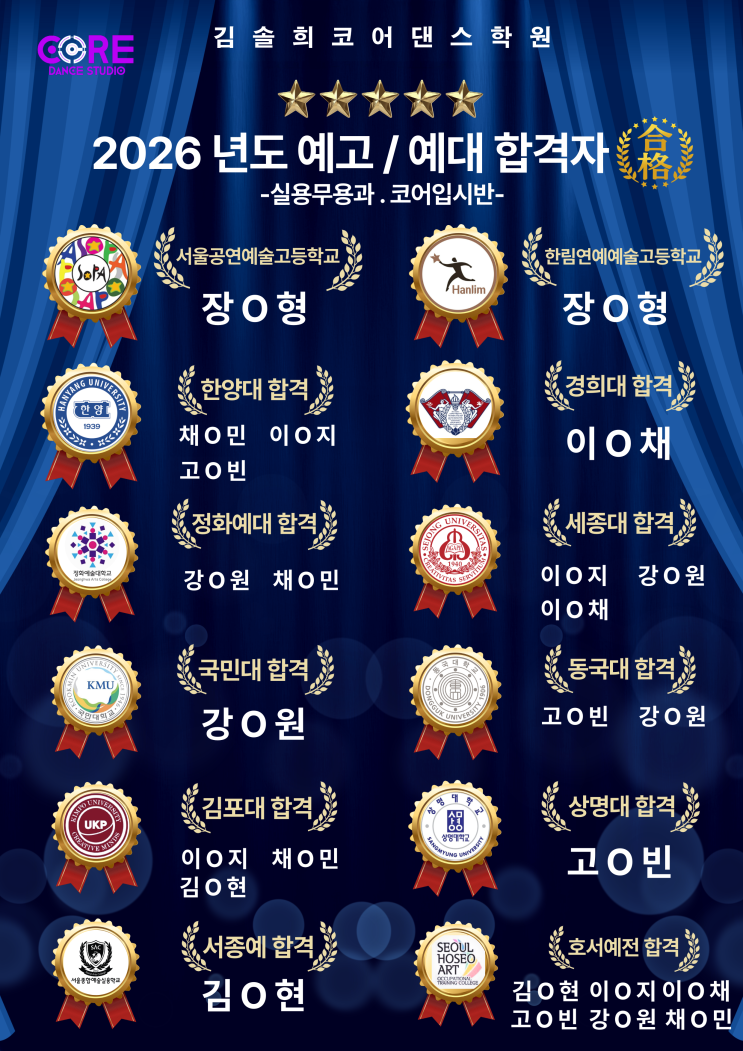 ⚜️2026년도 예고/예대 입시 합격자⚜️ _실용무용과 합격자_ 코어입시반 ⚜️2026년도 예대 합격자⚜️ 합격을 진심으로 축하합니다ㆍ 1년동안 고생많았어요 인생의 다음 챕터를 시작할 그대들의 발판이 될 수 있게 버티고 있을테니, 멋진 성인이 되는 그날까지ㆍ끝까지 응원하겠습니다❤️ ⚜️2026 University of Arts successful applicants⚜️ Congratulations on your acceptance. You worked hard for a year to start the next chapter of life, I'll be holding out to be your stepping stone. Until the day you become a wonderful adult, until the end. I'll support you❤️ ✨️코어입시반....... <img src="https://blogthumb.pstatic.net/MjAyNjAxMzFfMTI1/MDAxNzY5ODM4MjgyMDM1.fimrkQFiEmTtymobpfqjXx68XvWeTy-0LdkGfdxy4qog.2J5LA10f8dW7ujZ7it2vSmKHjmrYNmn9wcppL_IqbO4g.PNG/%C1%A6%B8%F1_%BE%F8%C0%BD-19.png?type=s3" />