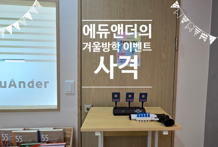 겨울방학이 시작되었습니다. 방학마다 작은 이벤트를 준비하고 있는데요, 이번 이벤트는 사격입니다. 에듀앤더에서는 공부 계획과 함께 휴식 시간에 대한 계획도 학생들이 스스로 세워서 실천합니다. 자신이 계획한 휴식 시간에 원하는 학생들이 사격 게임을 할 수 있도록 준비했습니다. 점수에 따라 달콤한 선물도 있답니다. ^^ 이벤트 기간은 1월 23일까지였는데, 학생들이 연장을 원해서 상품이 떨어질 때까지 해보자고 하고는 상품을 추가로 채워주고 있습니다. 겨울방학이 시작하면서 이번 방학을 어떻게 보내면 좋을지 계획을 세워 보았습니다. 에듀앤더에서의 학습은 계획 세우기 - 일대일 개념학습과 개별학습 - 휴식 - 개별학습 및 숙제....... <img src="https://blogthumb.pstatic.net/MjAyNjAyMDdfMjA0/MDAxNzcwNDI2OTg2MTYz.ac3Jpk211nrXHNNHdMgPULvZDzjEWws6zUE5IaRZMOQg.Jcqnsa76YS-Ba7J9M4LoMEdvogv4tlMS619ZvyRXb7gg.PNG/image.png?type=s3" />