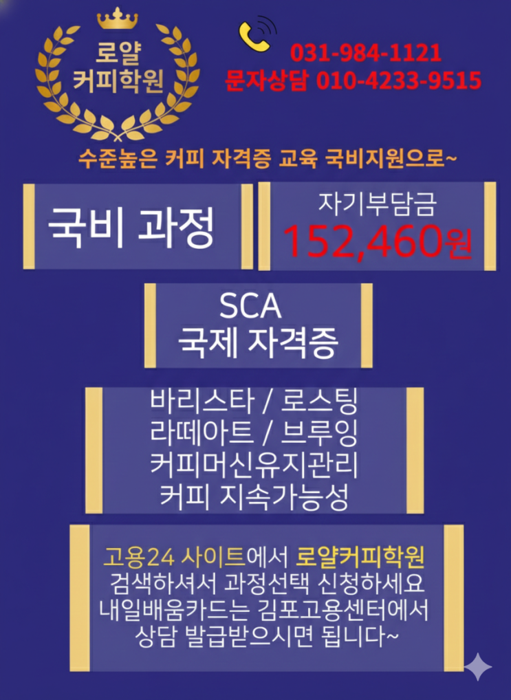 #바리스타자격증 국비과정은 정원10명으로 고용24사이트에서 수강신청하시면 됩니다. 선착순입니다. #국비과정 은 바리스타2급 3시간씩 12회차 바리스타1급 은 3시간씩 14회차 진행됩니다 #SCA 국제자격증 바리스타 초급+중급 과정은 3시간씩 16회차 입니다. #카페메뉴 마스터 와 머신관리 과정은 3시간씩 14회차로 진행됩니다. 국비지원이기 때문에 결석없이 참석하셔야하며 3회 결석시엔 제적처리됩니다. 지각,조퇴등 학교시스템과 비슷합니다. 많은인원이 단체수업하므로 대기시간이 있고 서로 배려하며 훈련에 참여하셔야하며 개인이 아닌 단체기 때문에 일정 그대로 진도 나갑니다. 일반과정은 소수4명이하 인원 진행이며 수시개강입니다 스....... <img src="https://blogthumb.pstatic.net/MjAyNjAyMDlfMjkg/MDAxNzcwNTcxMzU0MDAx.75ub612tnqVhbPY1GR5tMR15FwbJLlx1bsHomdYE0xUg.eaiyuR2ufeR5M5A4Av4cgy9yLdemBfSfRFlpRdkFZG0g.PNG/1770557654437%A3%A81%A3%A9.png?type=s3" />