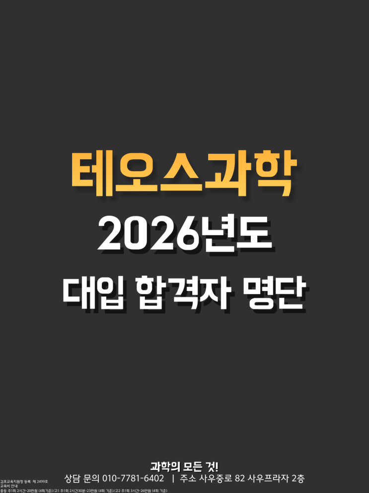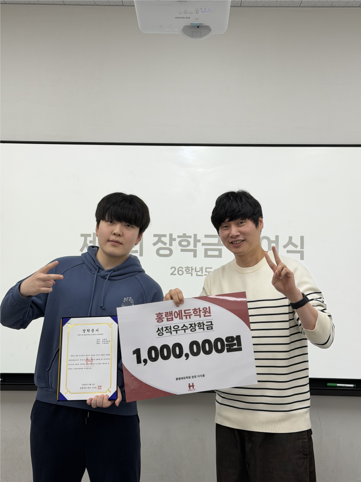 안녕하세요~ 오늘은 홍랩에듀학원만의 특별한 [제 2회 대입 성적 우수장학금 수여식]을 진행하였습니다~!! WOW ~~!! [홍랩에듀학원 성적우수장학금 수령 조건] 1. 고교 3년간 재원(개근) 2. 3년 전체 영어내신 1등급 or 수능영어 1등급 3. 우수 대학 합격 등의 깐깐한 원내규정을 토대로 우수한 성적을 보여준 학생들에게 대입 성적 우수장학금을 수여합니다! 2026년 2월 3일, 제 2기 홍랩에듀 대입 성적 우수장학생 3,4호 자랑스러운 두 학생들에게 장학금 100만원을 지급하였습니다! 김포제일고등학교를 거쳐, 충남대학교 수의예과에 당당히 최종합격한 장학생! 축하합니다! 김포제일고등학교를 거쳐, 경상국립대학교 수의예과에 멋지....... <img src="https://blogthumb.pstatic.net/MjAyNjAyMTBfMTQ0/MDAxNzcwNzI2MDI2MTEy.F4QJPluVoiAhJ5FjRGSKnEYuGtUcoPaqEeW74qcpF5Ig.KacghuNd6e94MVr1tKqGwoIAlPYZbO4eVbWTimUqL18g.PNG/image.png?type=s3" />