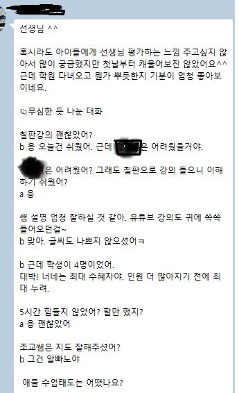 Black반 첫 수업 후 학부모님과의 톡입니다.