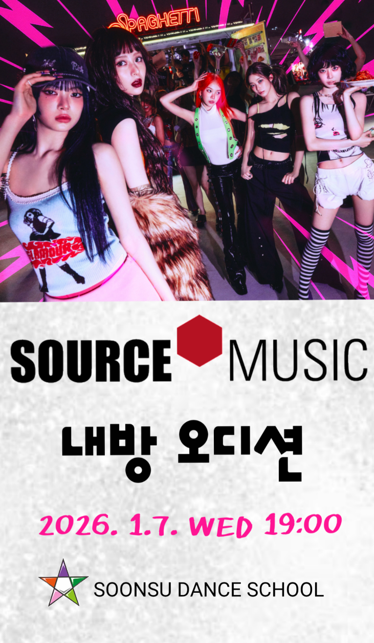 안녕하세요. 광진구 댄스학원 순수댄스스쿨 입니다. 2026년 1월 7일 수요일 오후 7시. 순수에서 쏘스뮤직 내방 오디션을 진행합니다. -지원 분야 : 노래, 랩, 댄스, 연기 중 1분야 -지원 연령 : 2014년생~2007년생(12세-19세) 성별 국적 무관 / 순수댄스스쿨 수강생 누구나 많은 학생들의 지원 부탁드립니다. ☎ 문의 : 02- 815- 2343 <img src="https://blogthumb.pstatic.net/MjAyNTEyMTVfNTAg/MDAxNzY1NzI1MjIzOTU3.XekvMn1fVNhnPH418uq1UQ7PyFTleIocwrFusOKePTwg.pYZov-TcxdjS-GjY4BKplDLZqdEsO4JzxkqkXGDhHhkg.PNG/%BC%D2%BD%BA%B9%C2%C1%F7.png?type=s3" />